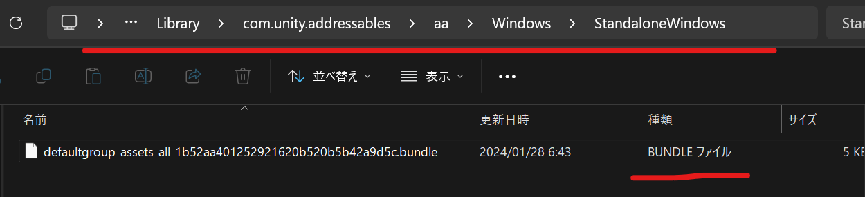 また、プロジェクトのビルド先のフォルダ内のXX(プロジェクト名)_Data / StreamingAssets / aa(bundleVersion) / StandAloneWindows(プラットフォーム)にも同じくバンドルファイルが配置されています。
