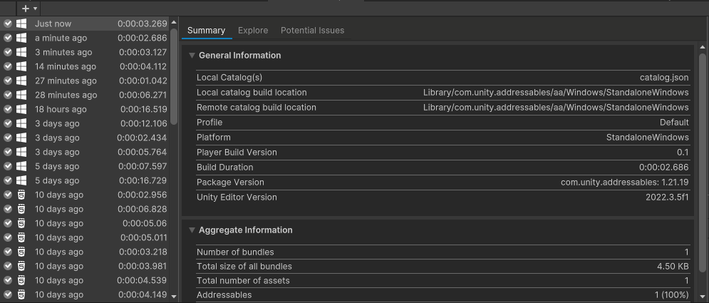 ビルドが完了すると、Addressables Reportウィンドウが表示されます。