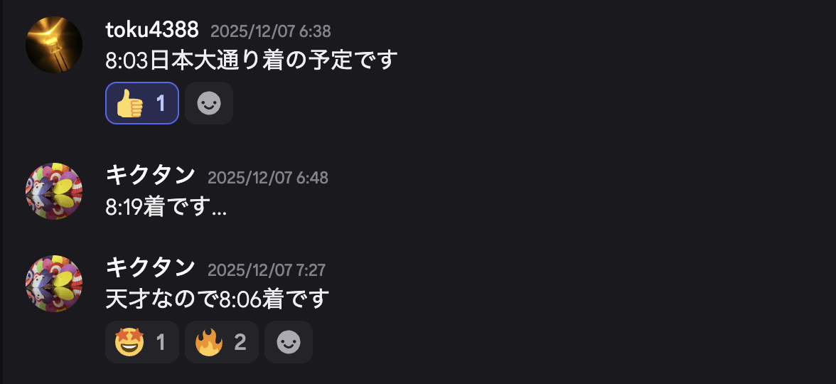 6時10分に起き、チームメイトに起床成功の旨を伝えます。全員ちゃんと起きれていました。優秀ですね。