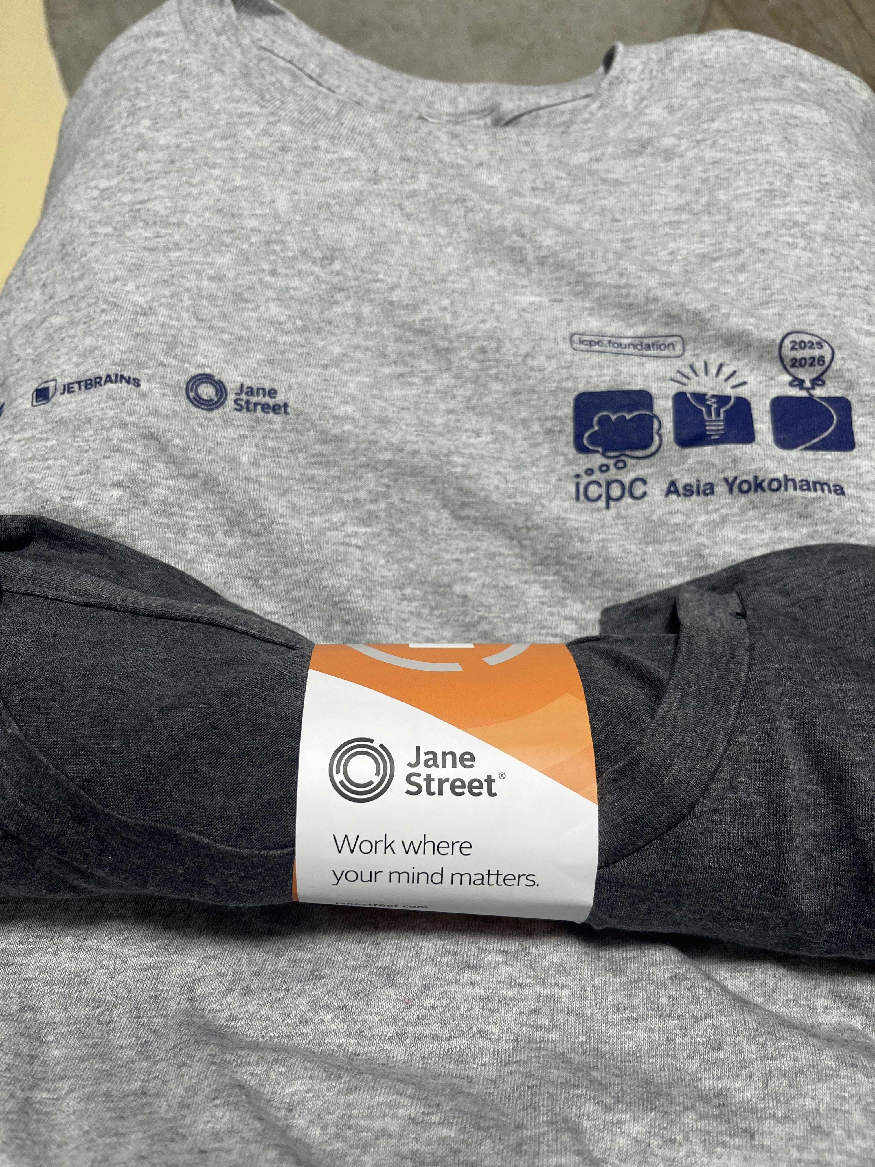 ここでICPC Tシャツをもらいました。今年は灰色でした。無難に着やすい色でありがたいと思います。またJane StreetのTシャツが机に置いてあり、自分はソファ問題のTシャツをもらいました。