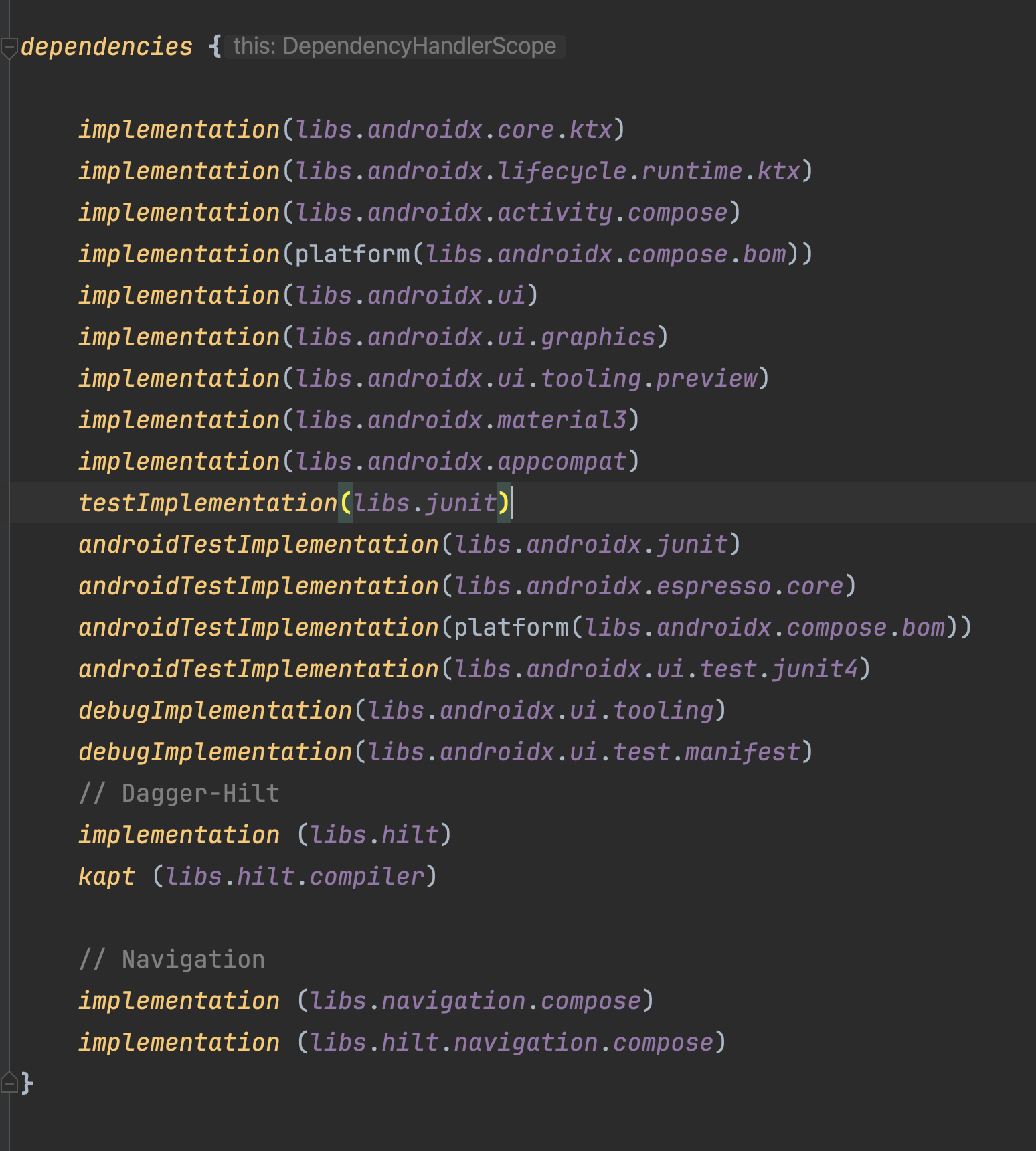 implementation(libs.hilt.navigation.compose) : HiltとJetpackナビゲーションを統合するライブラリで、