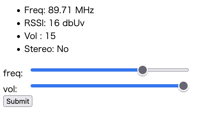 PCからESP32のIPアドレスへアクセスすると、ウェブブラウザからFMチャンネル(周波数)と音量を変更することができます。
