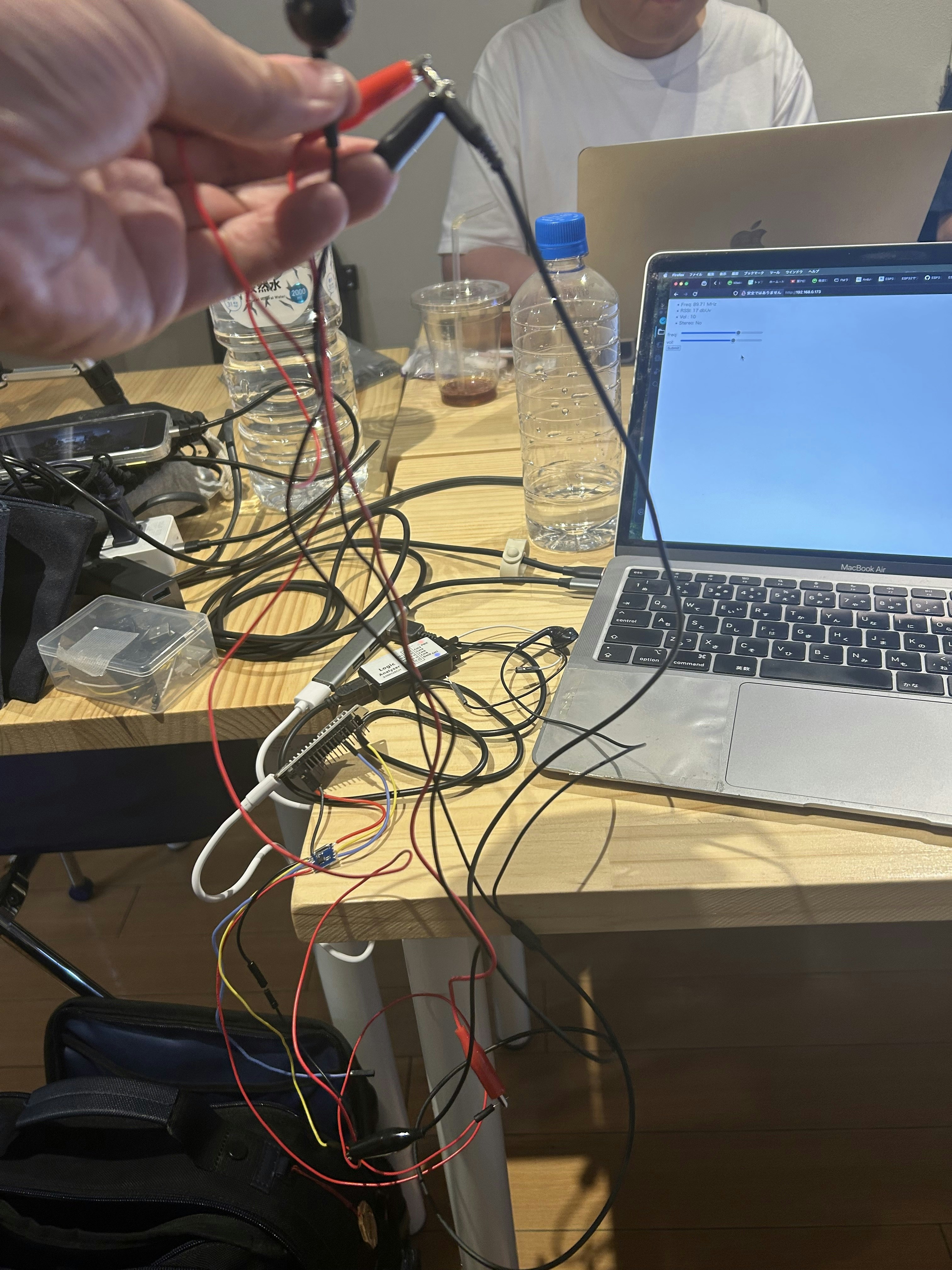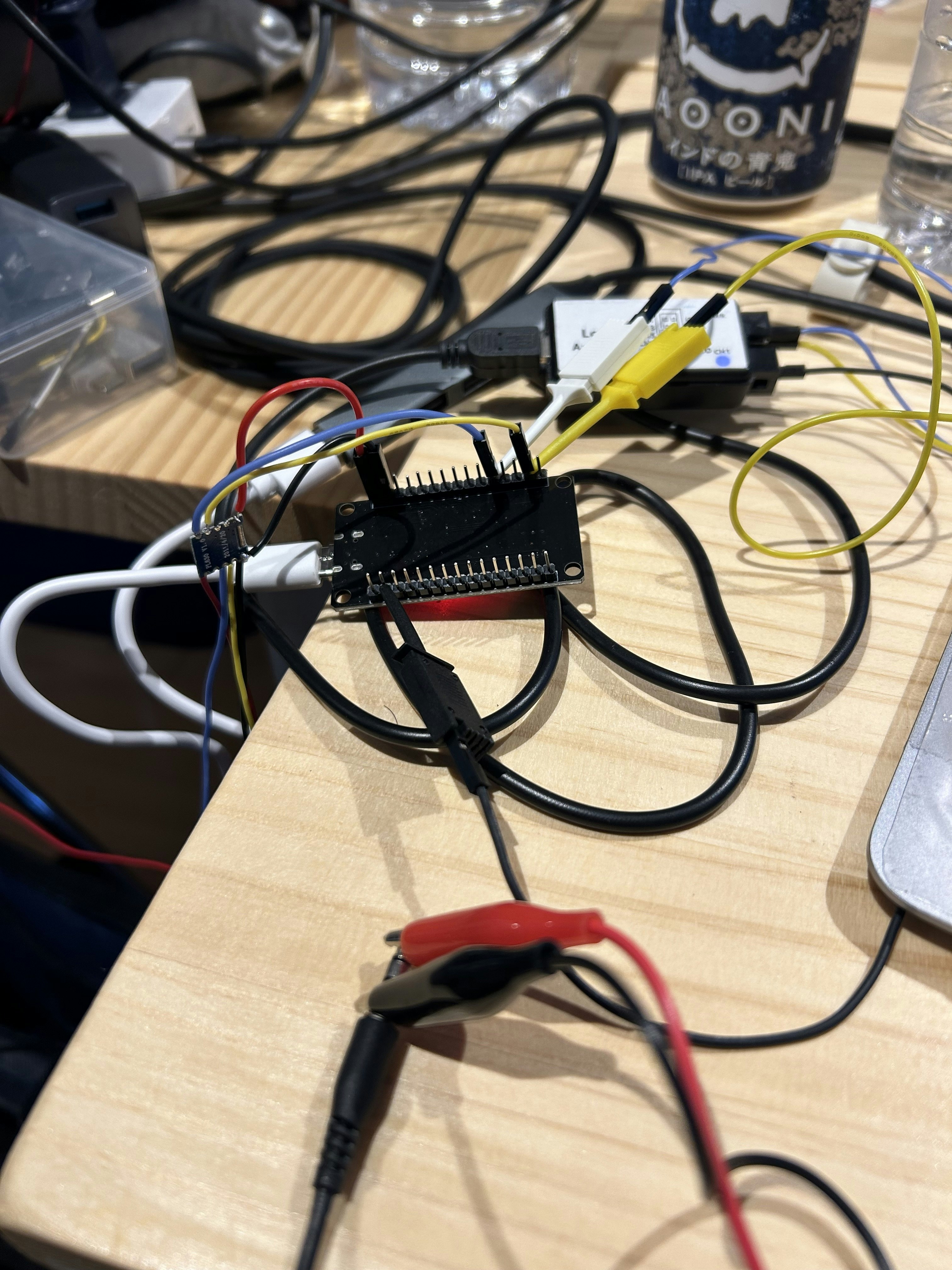 ロジアナとの接続は、GND, I2C(SDA, SCL)をプローブでつなげます。(空中配線)