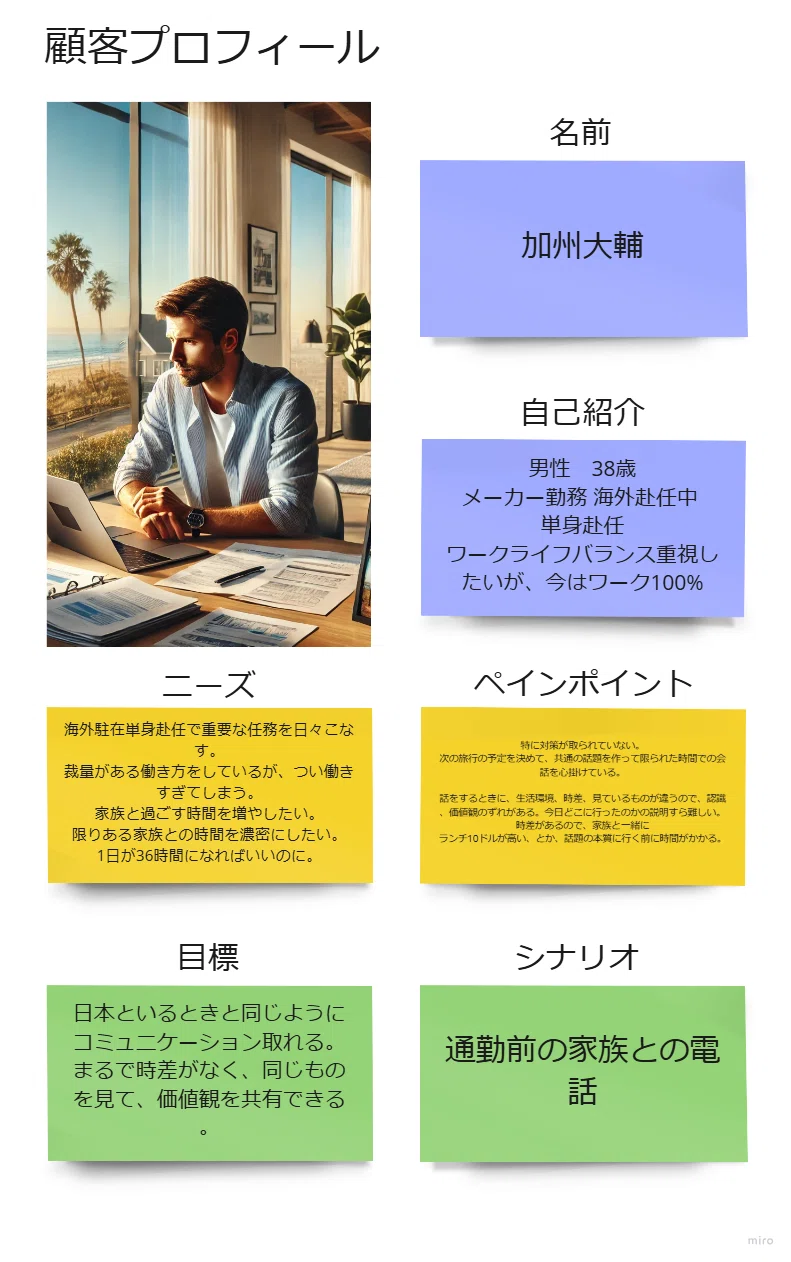- ペルソナ: 単身赴任者 「加州大介」(カリフォルニア在住、日本に家族を持つビジネスマン)を設定。
