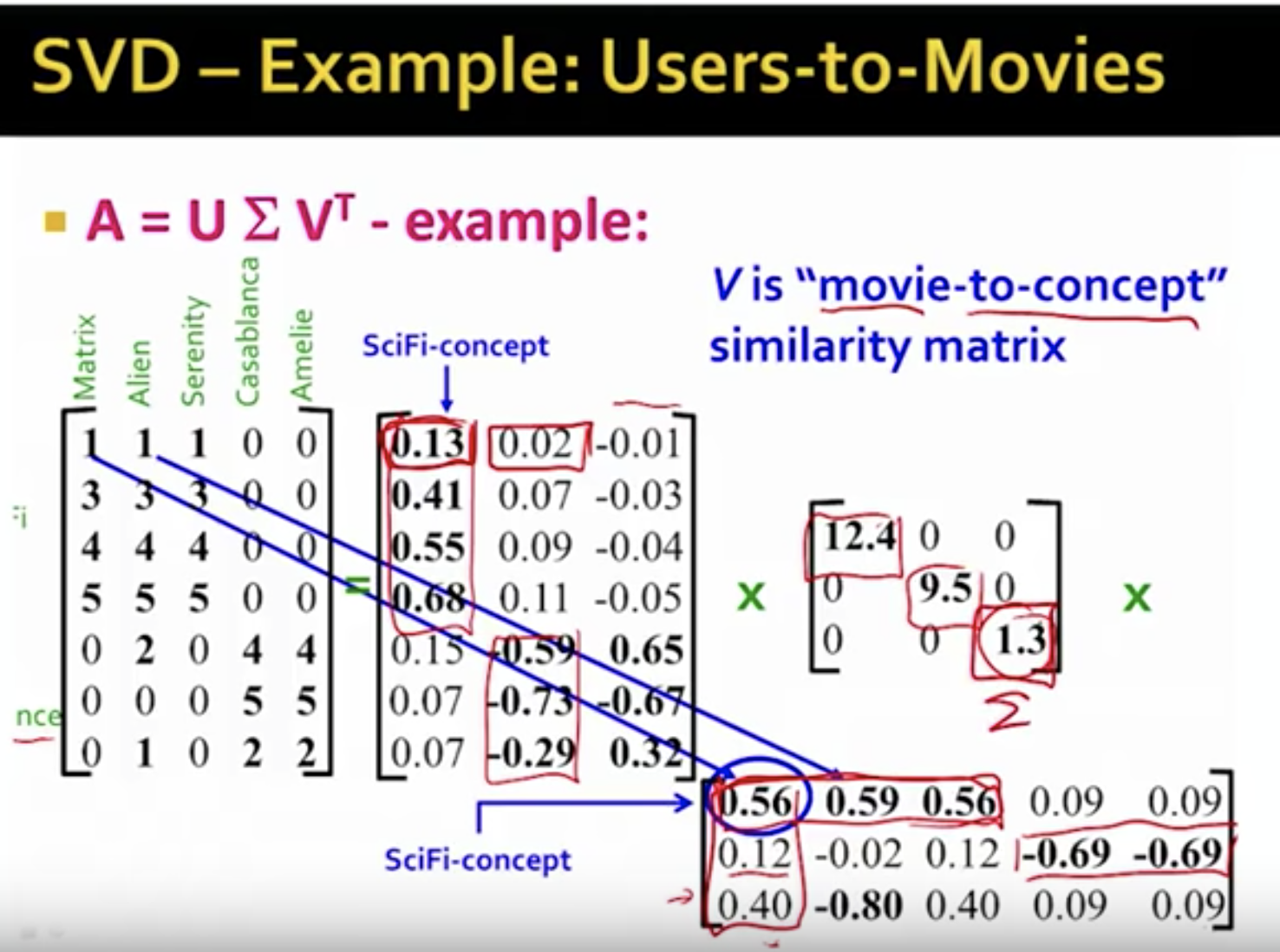 A is the user * movie matrix. The value is from 0 to 5, which indicate how much you like(5) or dislike(0) each movie. A can be divided, the scifi movies, romance-movies, third one is others which can be ignored.