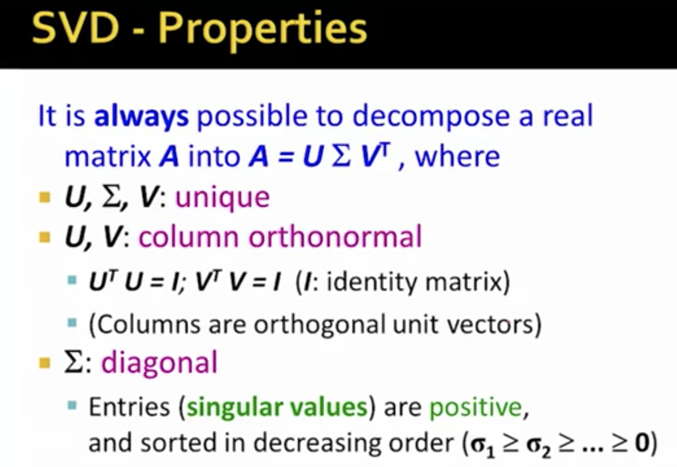 Σはr*rの対角行列(対角線上以外は0)。前提として値はdescending order(一番大きいのが最初、二番目が次。。。).
