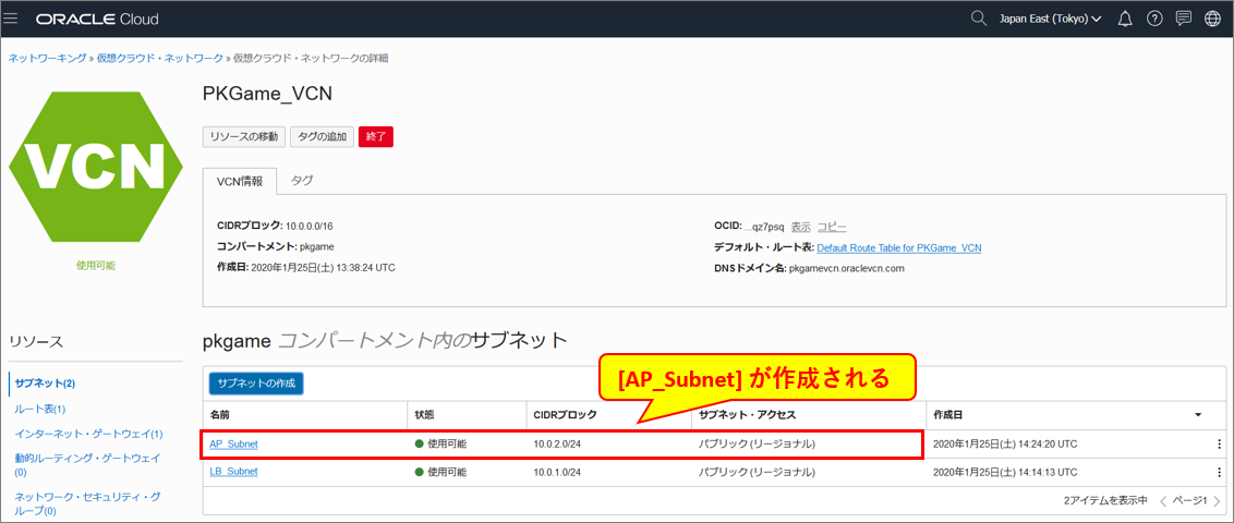 PKGame_VCN作成された後、[インターネット・ゲートウェイ]をクリック