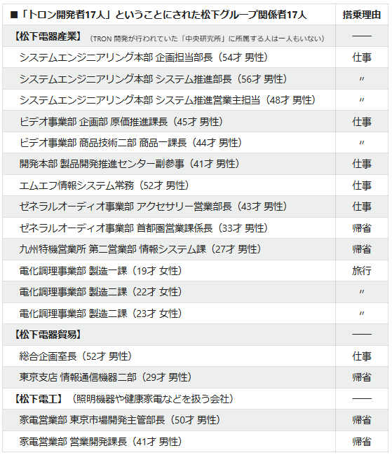 トロンを開発していたのは松下電器の中央研究所なので、所属や役職を見れば、それがデマだとわかります。所属が異なっていても関係していた人がいたかもしれないという反論は「17人」という数で否定されます。17人とは搭乗者524人中の「松下グループ」の人の数です(縮小されていないテキストの「17人の一覧」)。