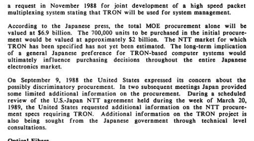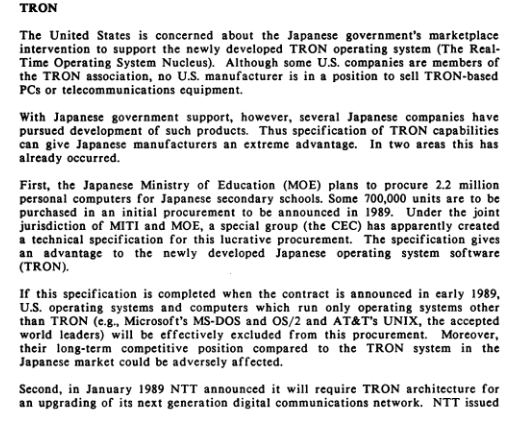 米国合衆国は、最近導入された TRON (The Real-Time Operating System Nucleus) プロジェクトを支援するために日本政府が介入する可能性について懸念している。これは、日本電子工業振興協会によって開始された取り組みである。TRON 協会には一部の米国企業も加盟しているが、TRON をベースとしたパソコンや通信機器を販売できる立場にある米国の製造業者は存在しない。