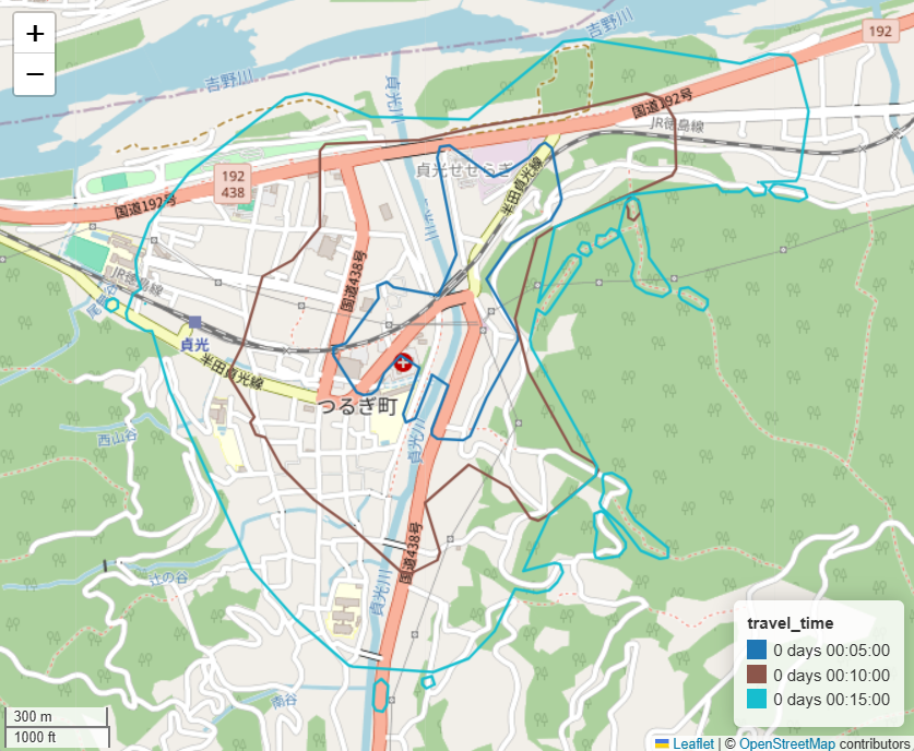 isochrones.htmlを開くと以下のような図が表示され、移動時間ごとに到達可能なエリアを可視化できます。