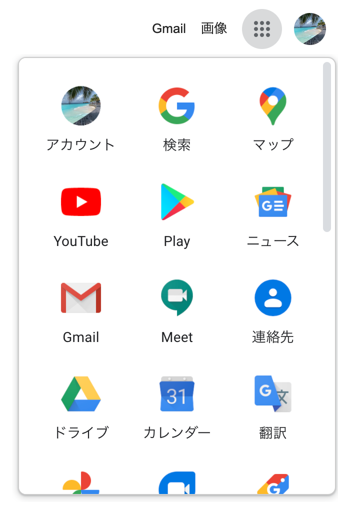 ①送信用に利用するGoogleのアカウントでブラウザを開き、右上にタブを開きアカウントを開きます。