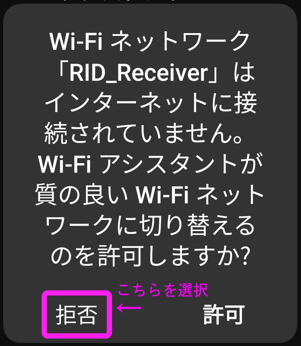 (機種によってはもっと質の良いWiFiに繋ぎたい見たいなメッセージが出る場合があります。このときは[許可]ではなく[拒否]を選択して下さい。)