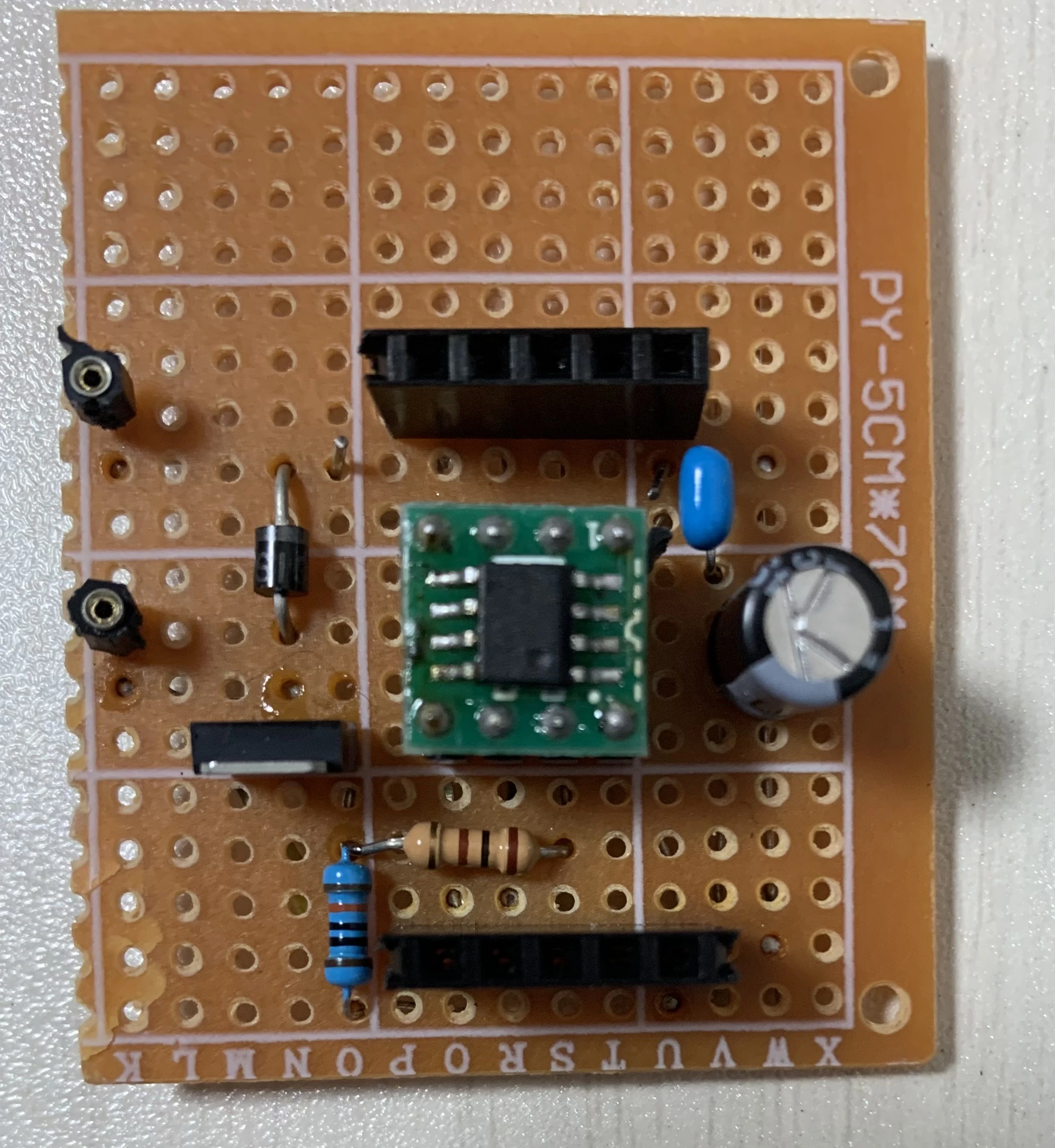 - バイパスコンデンサC1,C2:直流電源の安定性確保のため、周波数帯に応じた2種のセラミックコンデンサを配置