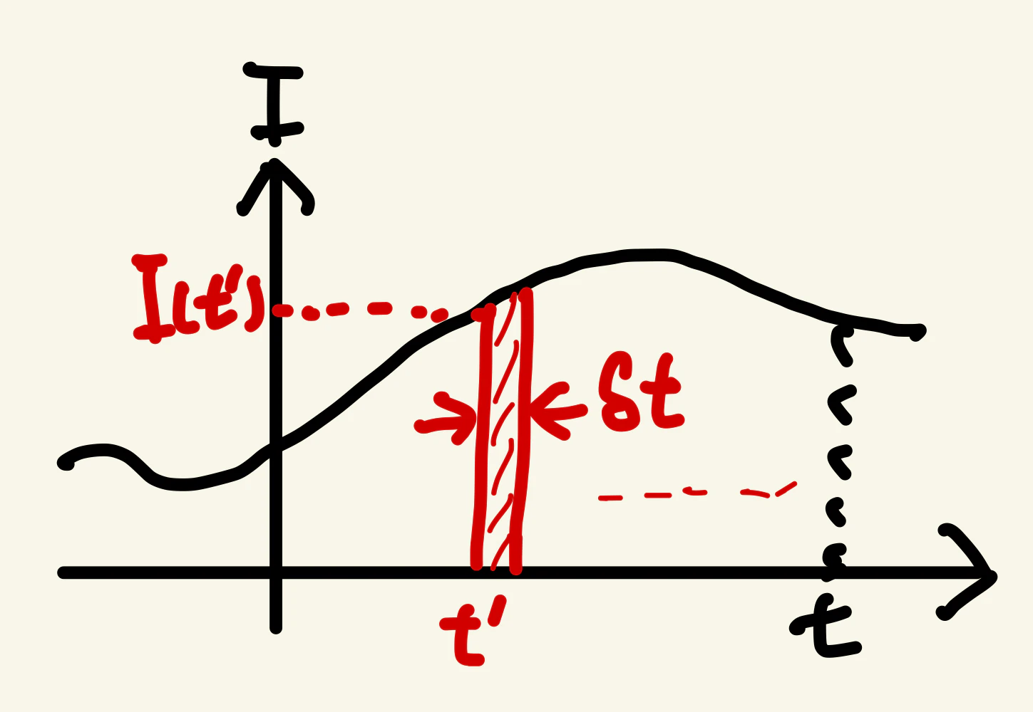 $I(t)$は連続関数ですが、便宜上以下のようにデルタ関数で分解します(図1参照)。