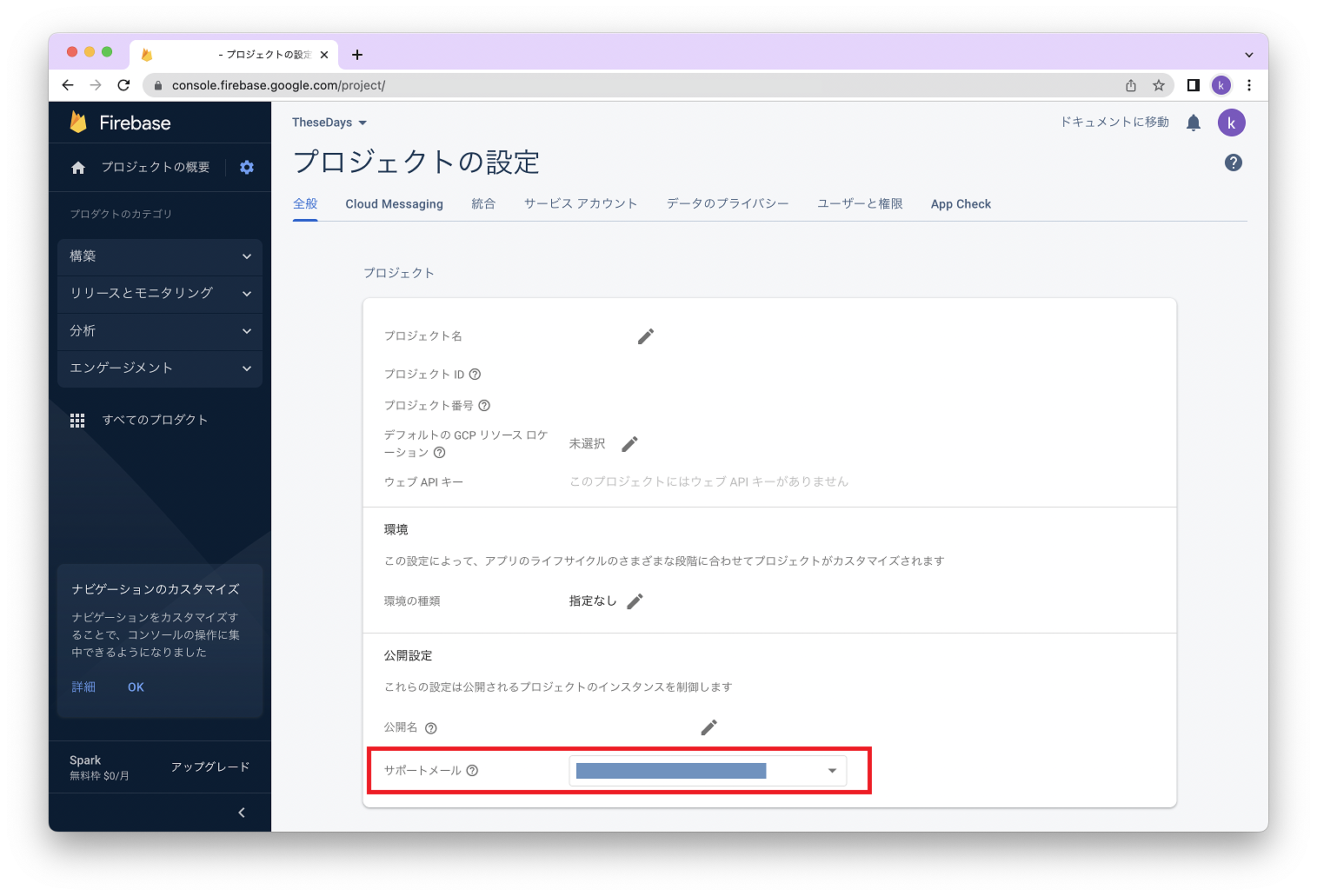- プロジェクトの設定(SHA1を設定したページ)でサポートメールを設定します。