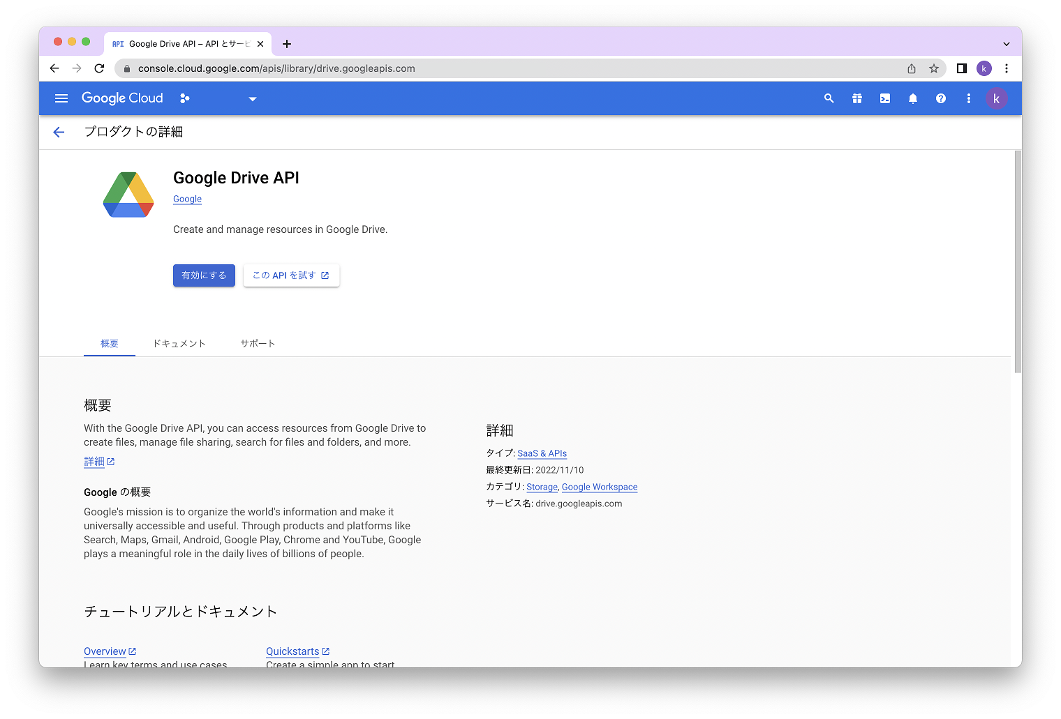 私の場合は Google Drive API を使うのでそれを有効にします。