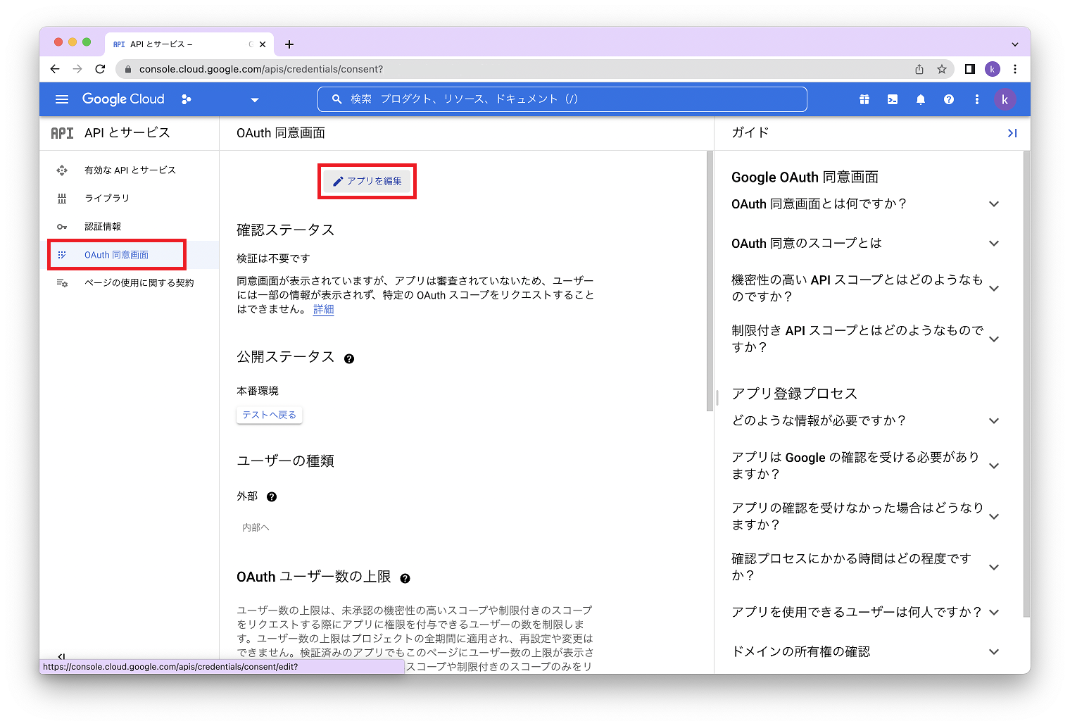 新しいプロジェクトを作成したときにハマりました。フィンガープリントは知っていましたが、OAuth 同意画面はいつのまにかやっていたのでしょう。AWS も GCP もこの手のごにょごにょが多いですね。