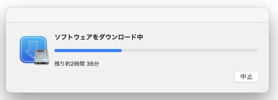 初めは2時間以上の表示が出ましたが、なんだかんだ5分くらいでインストール完了しました。