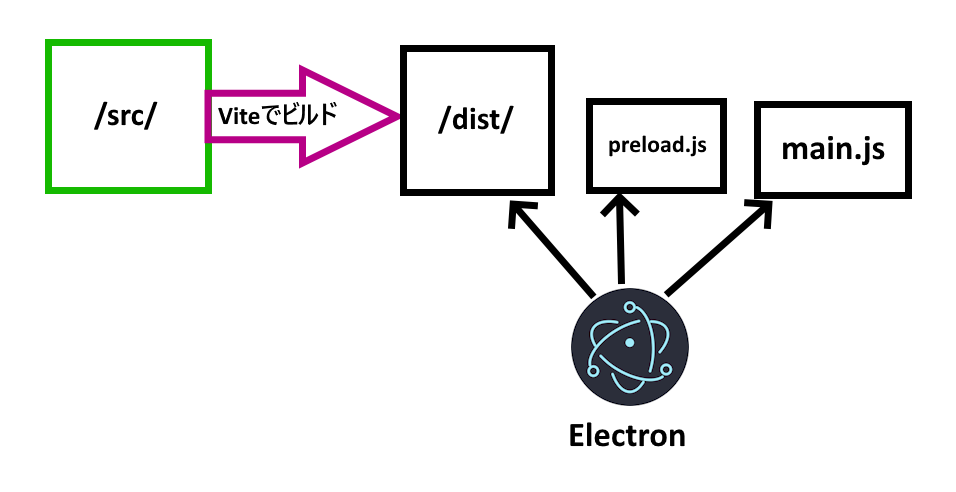 仕組みとしては、Vueで書いたコードをViteでビルドし、/dist/フォルダの中身をElectronが開く、といった感じです!