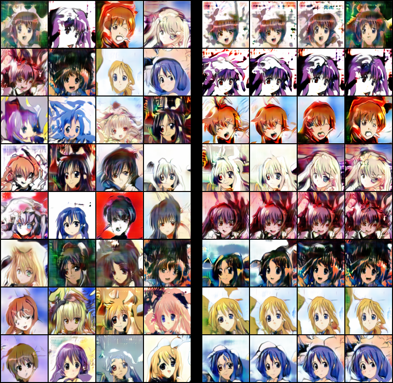 (左:サンプリング、右:補間です)。まずクォリティが全然違いますし、補間をすると潜在空間の乱数を動かすにつれて表情や顔の向きが変化しているのがわかります。