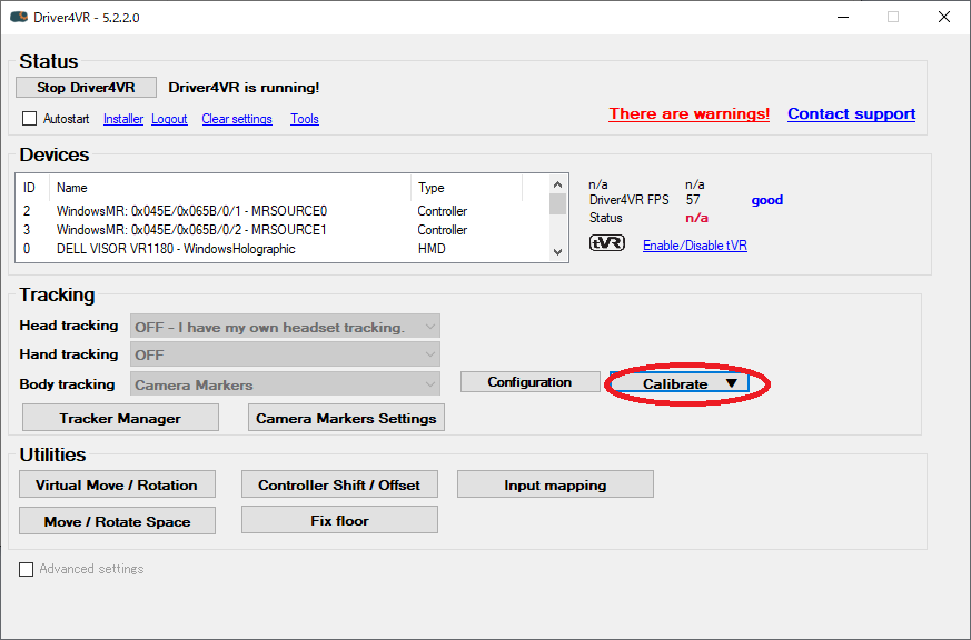 - Driver4VRを起動してBODY TRACKINGの項を「camera marker」に切り替えます