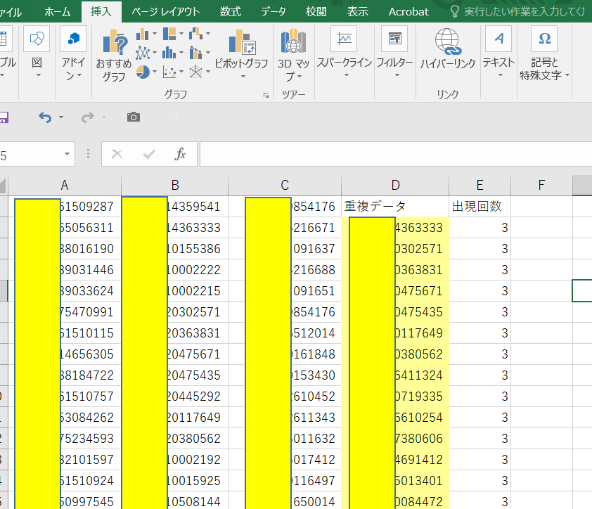この中から、同じ数字のデータを 重複が多いい順にD列に表示させ、また、重複回数をE列に表示させるようにChatGPTに指示文章の 「プロンプト」 を入力していきます。このパターン以外もこれから研究していきたいと思います。