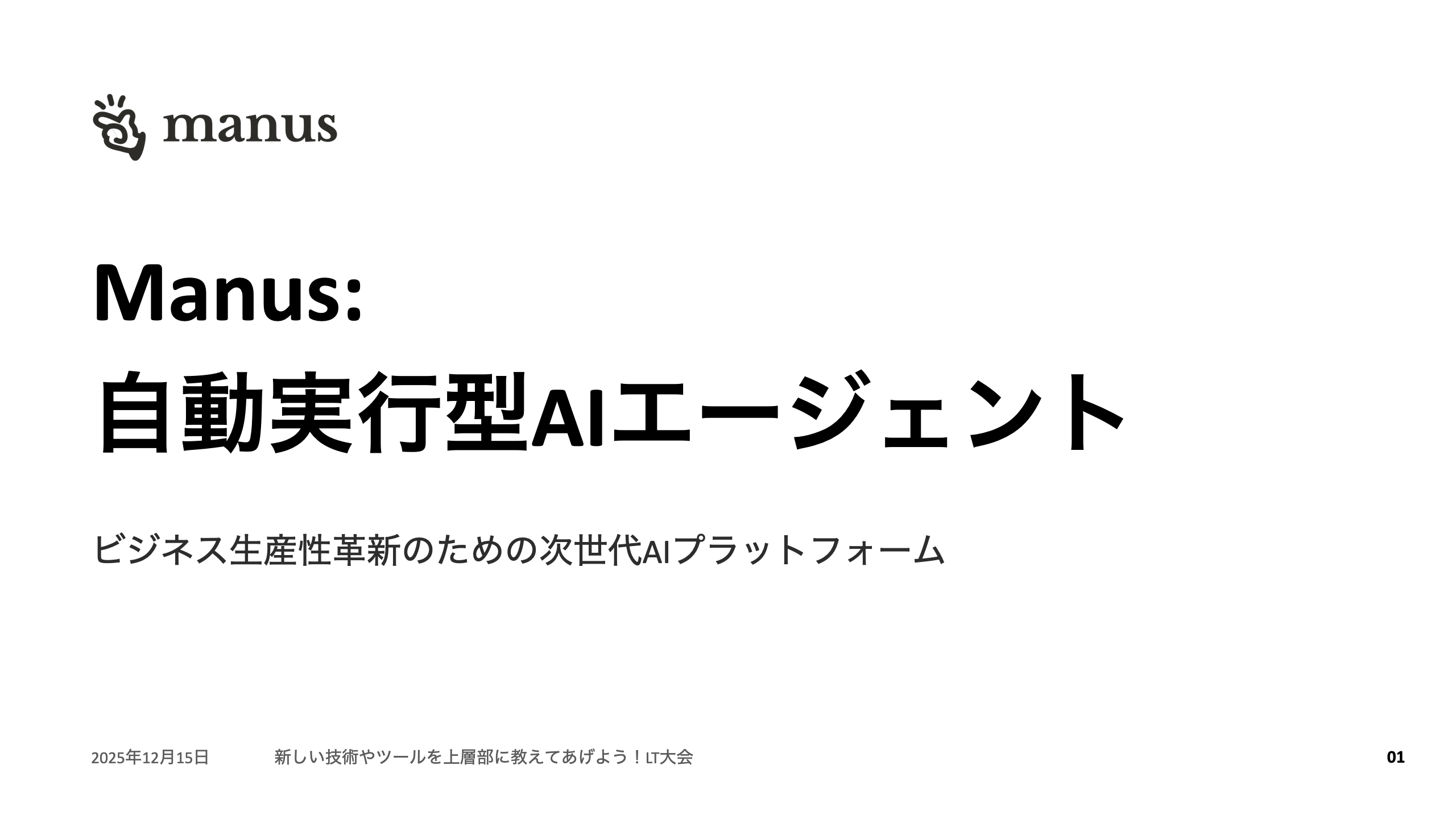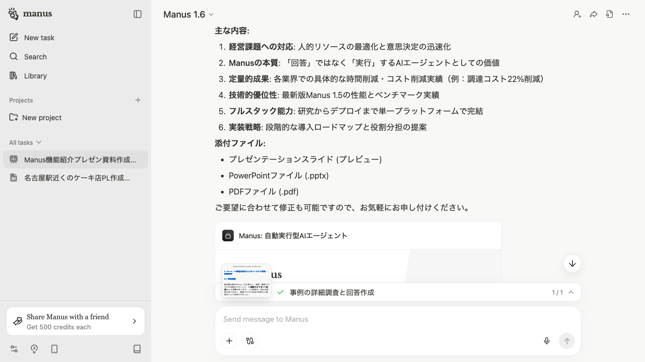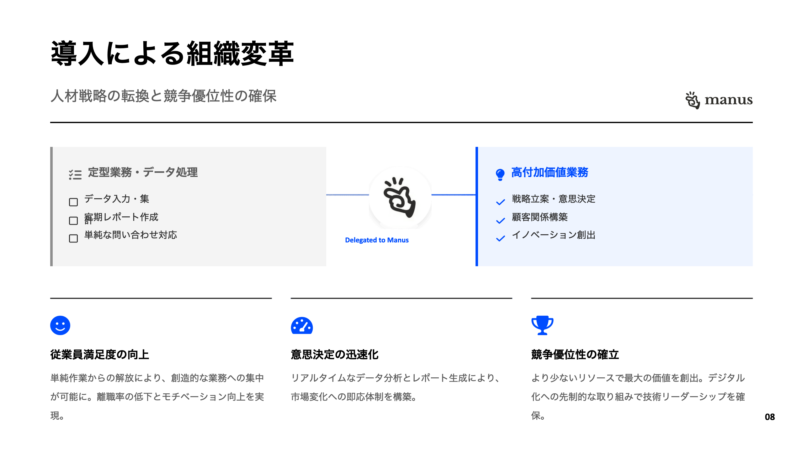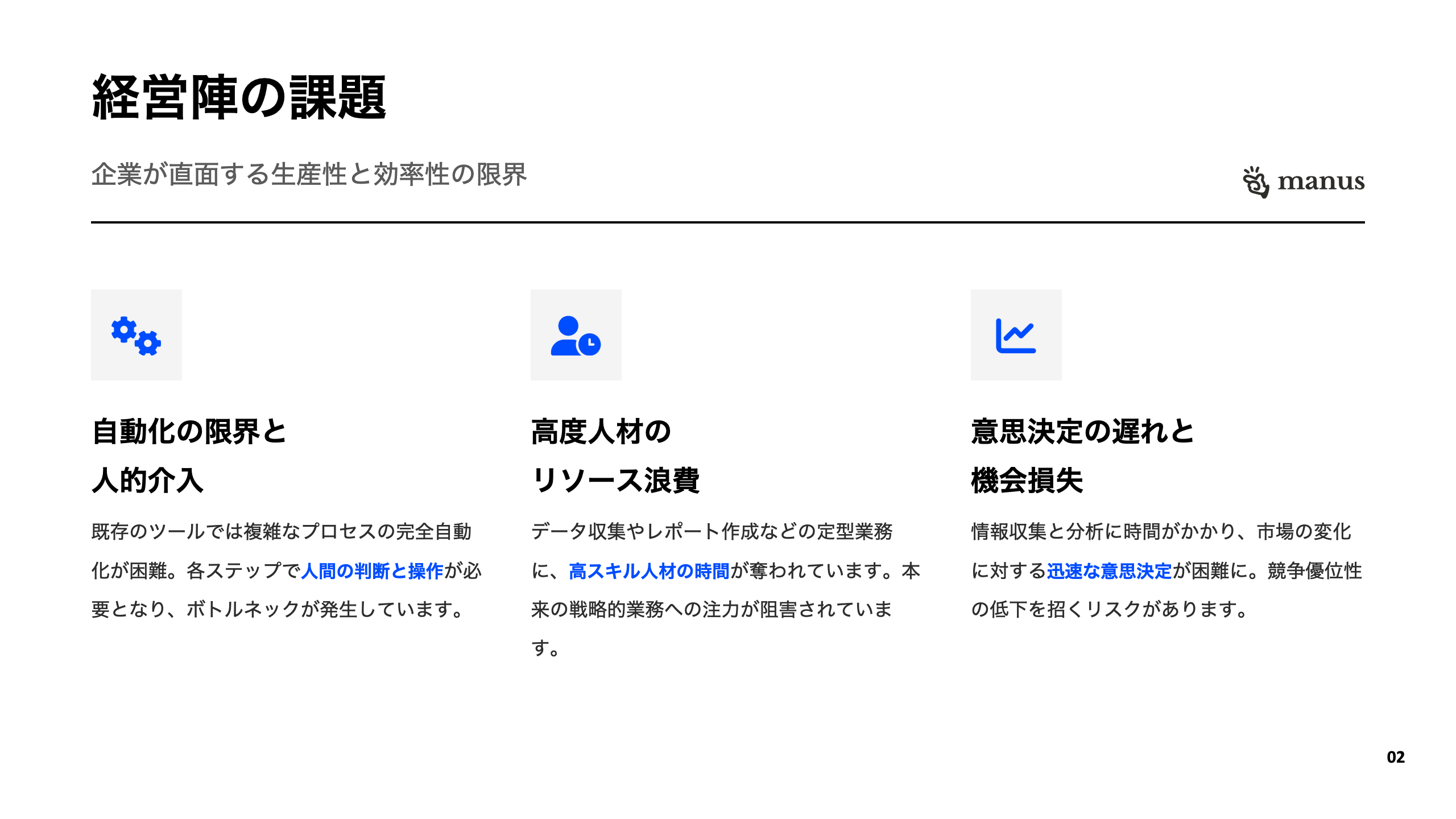 ただ、ManusでPowerpoint形式で出力させれば自由に編集可能ですし、既存の資料と組み合わせるとかもしやすいです。