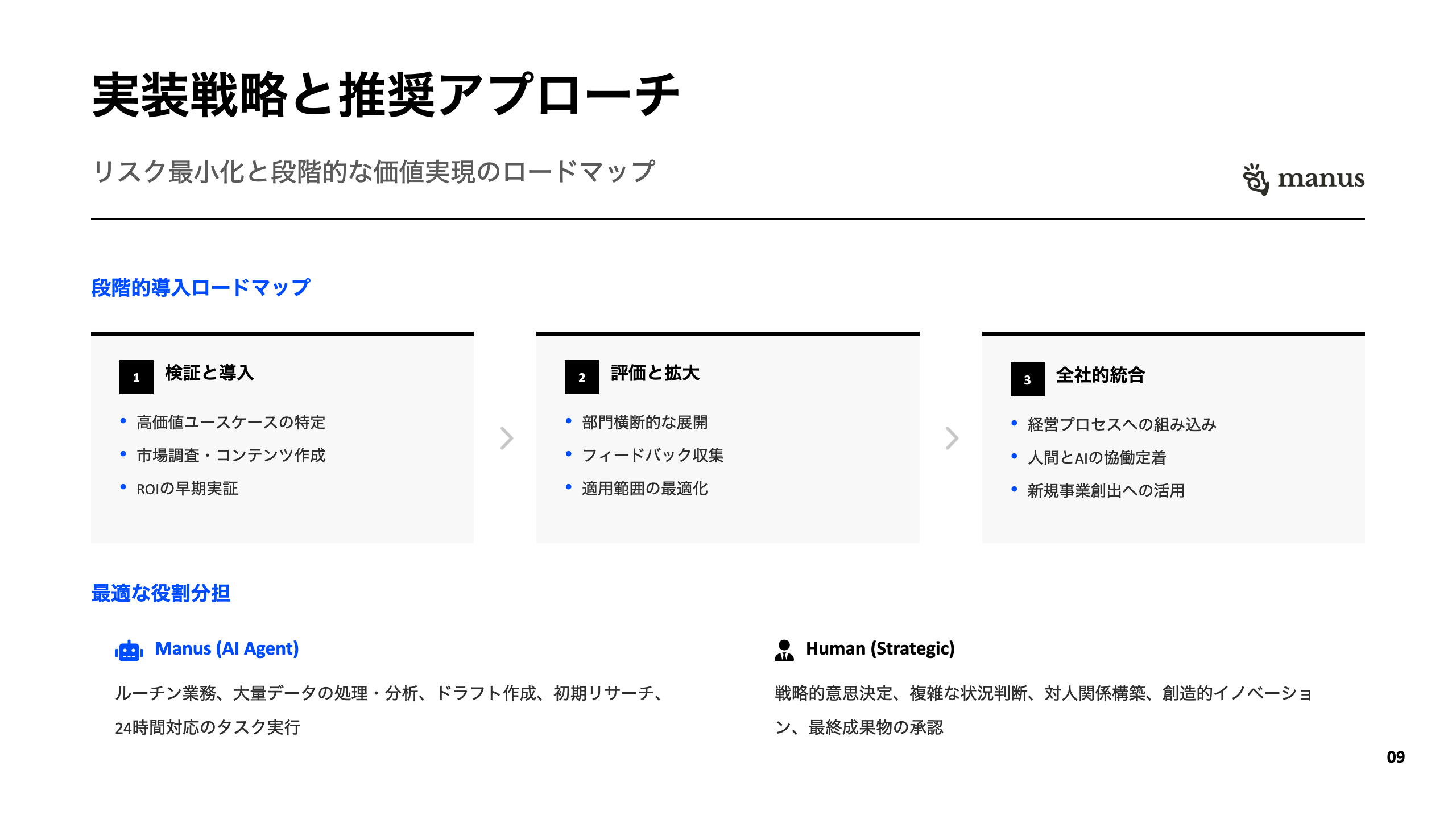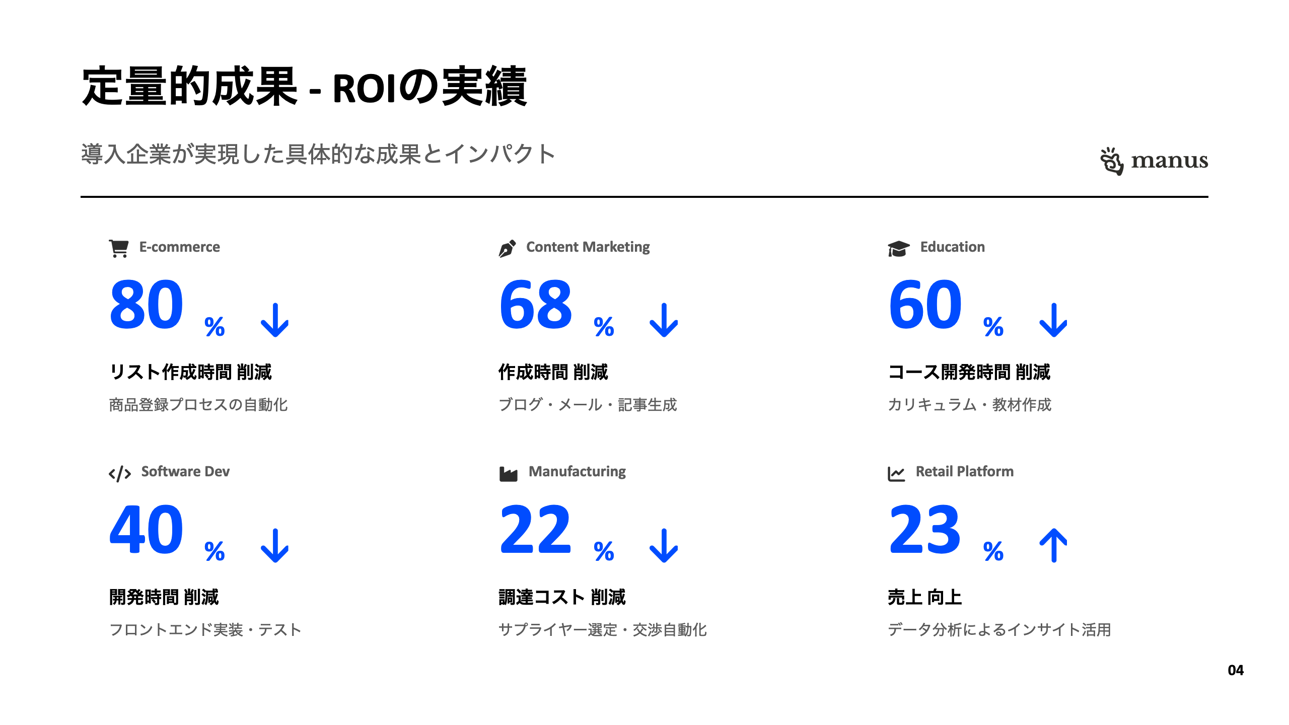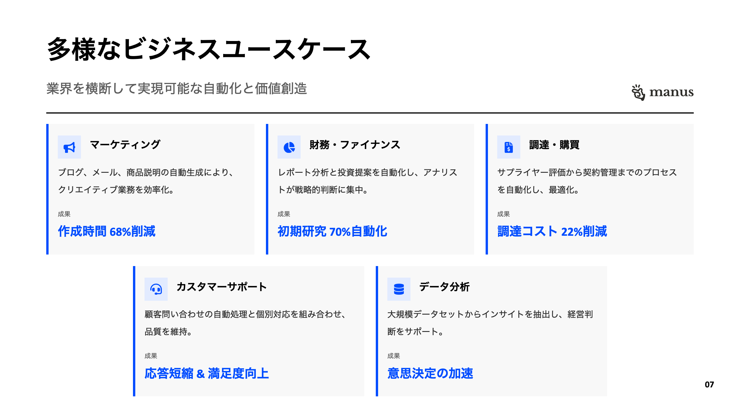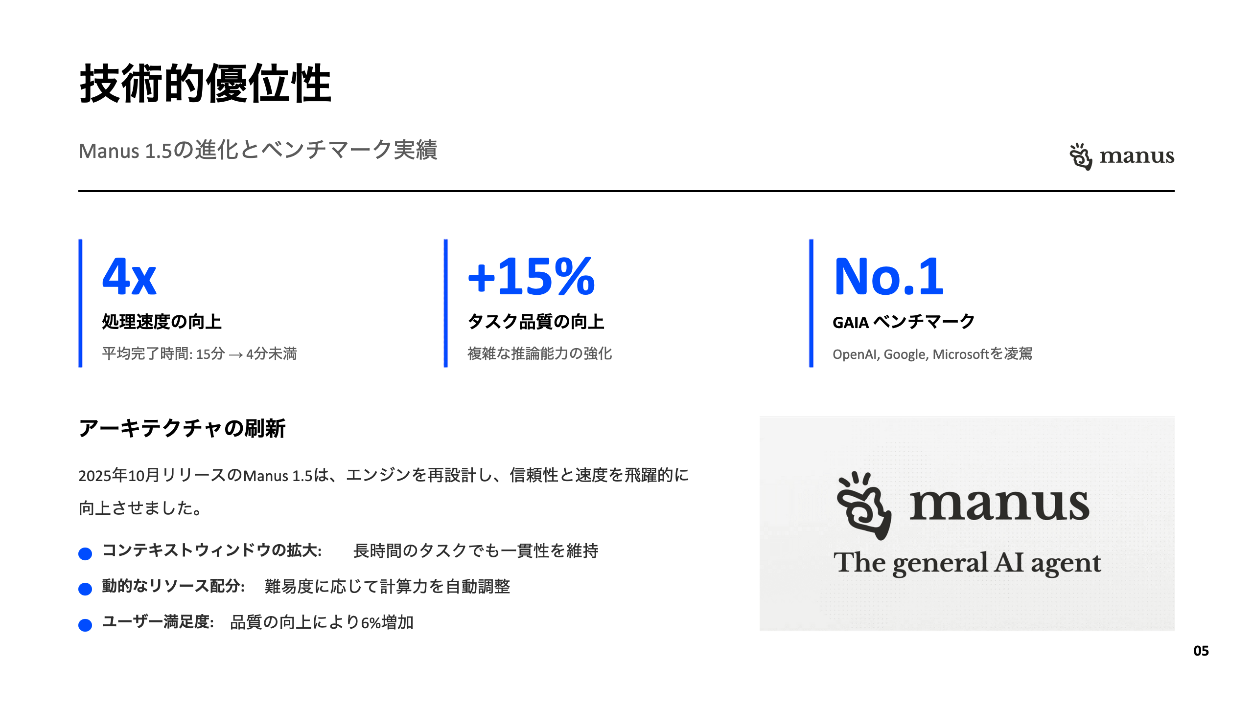 ただ、ManusでPowerpoint形式で出力させれば自由に編集可能ですし、既存の資料と組み合わせるとかもしやすいです。