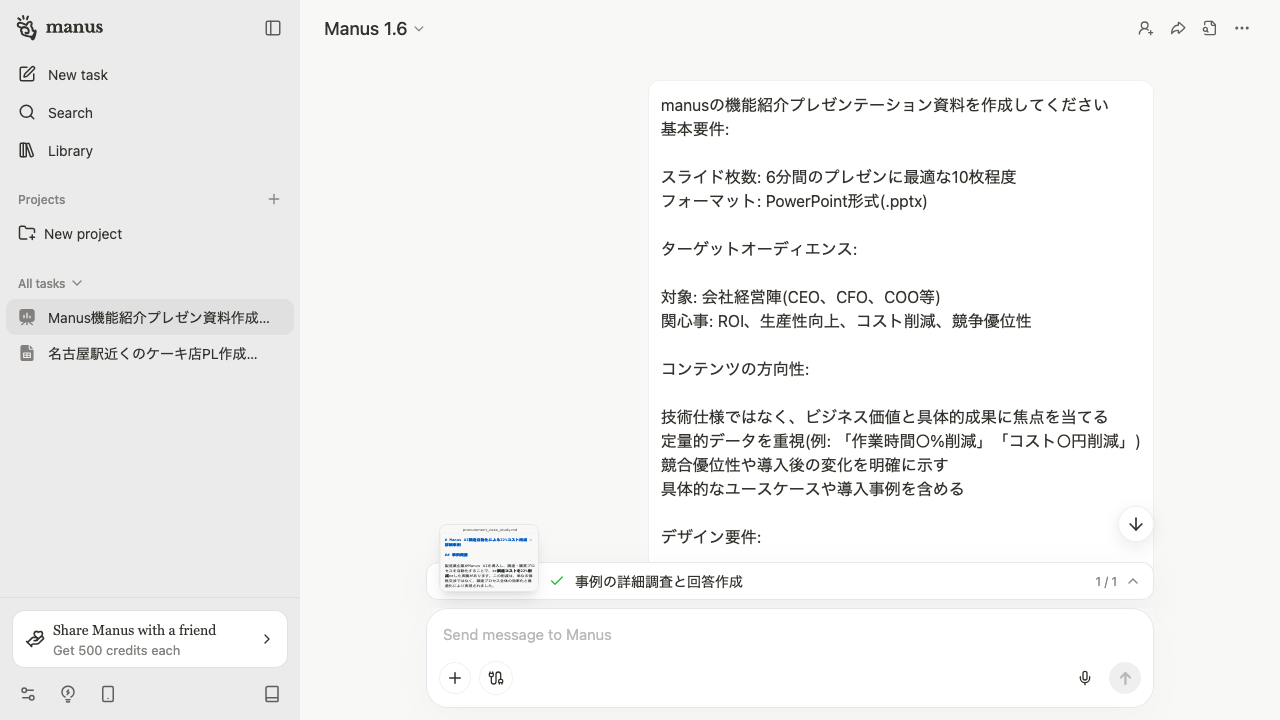 一方でManusは最終目標を与えるだけでかなり自律的に動いてタスクを完遂してくれます。
