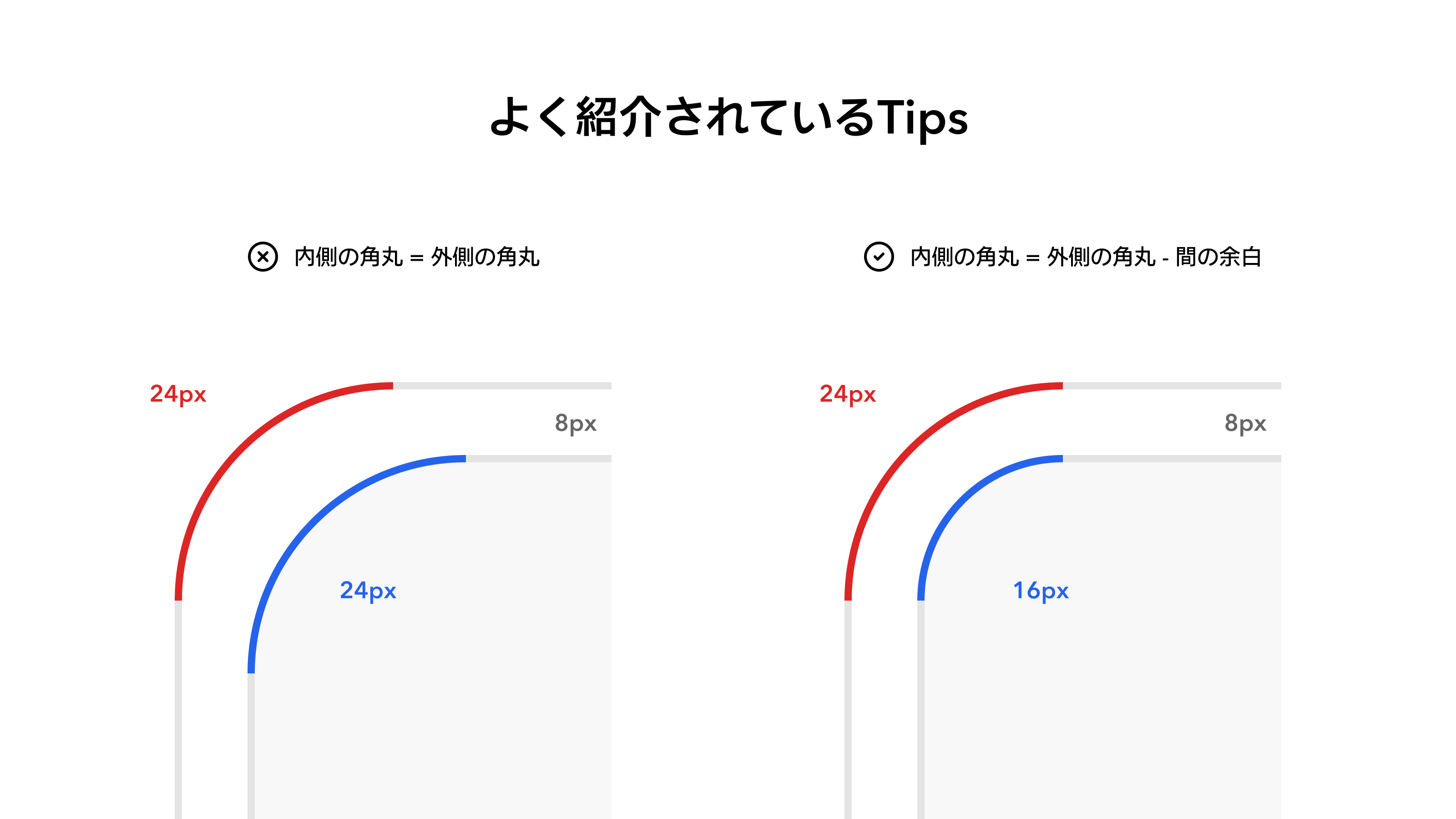 このルール自体は数学的にも理にかなっており、外側と内側の角丸の余白面積を均一にする法則として機能します。