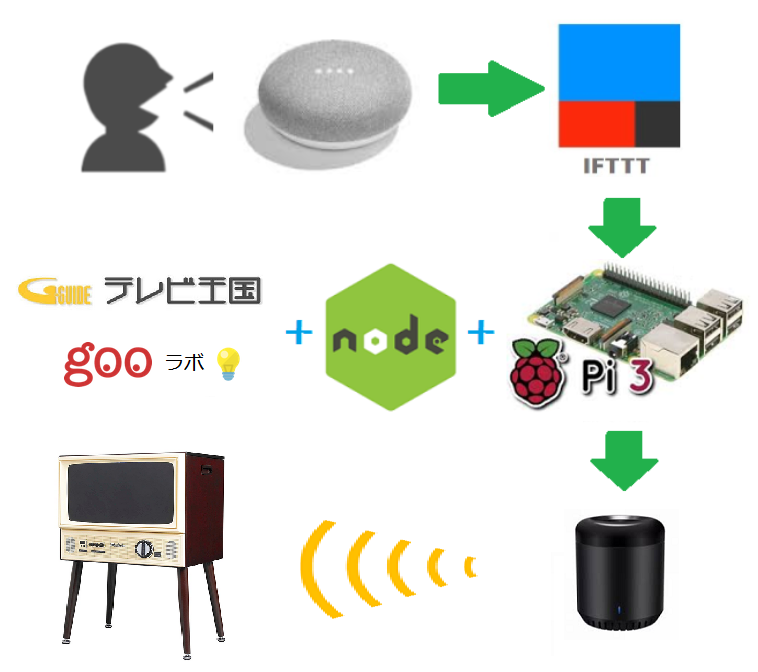 Google Assistant トリガーで「OK Google テレビを???にして」みたいなフレーズを設定して、取得したテキストを検索番組名として自宅の WEBHOOK サーバーに渡しています。