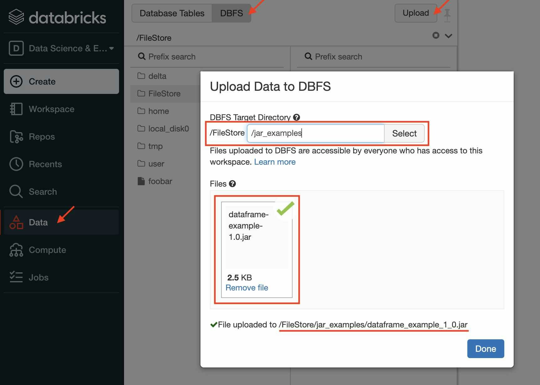 JARをDatabricks上で実行するには、JARファイルをDBFS(DatabricksのRootストレージ、実体はWorkspaceを作成したときにS3, Blob Storage, GCS)にアップロードする必要があります。