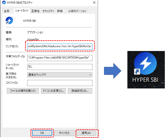 ※最後の「HyperSbiNoUac」は設定した名前、schtasks.exe /run /tnでタスク実行という意味