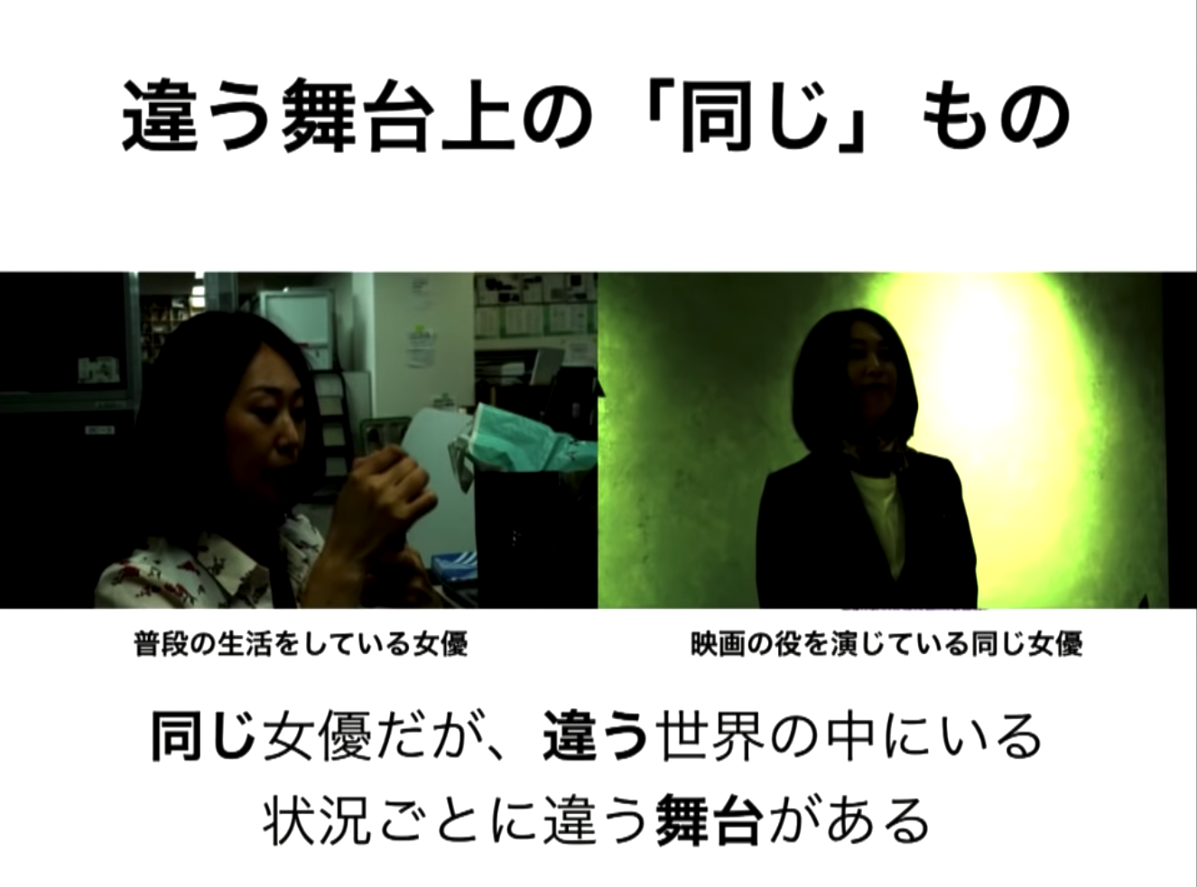 上記の画像は、ある女優さんの通常の生活と、映画の中の女優さんだそうです。勿論同一人物な訳ですが、僕らはリアルな女優さんとは握手することができるかもしれませんが、映画の中の女優さんはスクリーン上の世界ですので握手はおろか、映画の中の彼女に本人ですらコンタクトする手段を持ち得ません。でも紛れもなく、同一人物であり、映画の中の彼女は、彼女の人生という中の1シーンとして演じた作品の中の彼女です。すなわち彼女の人生という舞台の中で、入れ子の構造ができているわけです。こういった構造の中で共有できる情報というのは意外と少ないということもわかります。映画の舞台では、名前すら本人と違うわけですから。この入れ子の構造の中で、何が同じで何が違うのかを測るモノサシはどのように設計すべきなのでしょうか?そこに一つの示唆を与えるのがIUT理論(宇宙際タイヒミュラー理論)なのですが、上記動画では面白いトリックを使って説明されていました。