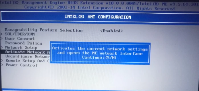 “Activates the current network settings and opens the ME network interface Continue:(Y/N)”