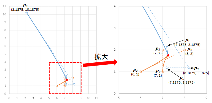 同様に、制御点 ${\boldsymbol{p}}_4, {\boldsymbol{p}}_5, {\boldsymbol{p}}_6, {\boldsymbol{p}}_7$ で定義されるベジェ曲線 ${\boldsymbol{B}}_1$ 上の任意の点の座標 $(x,y)$ は;