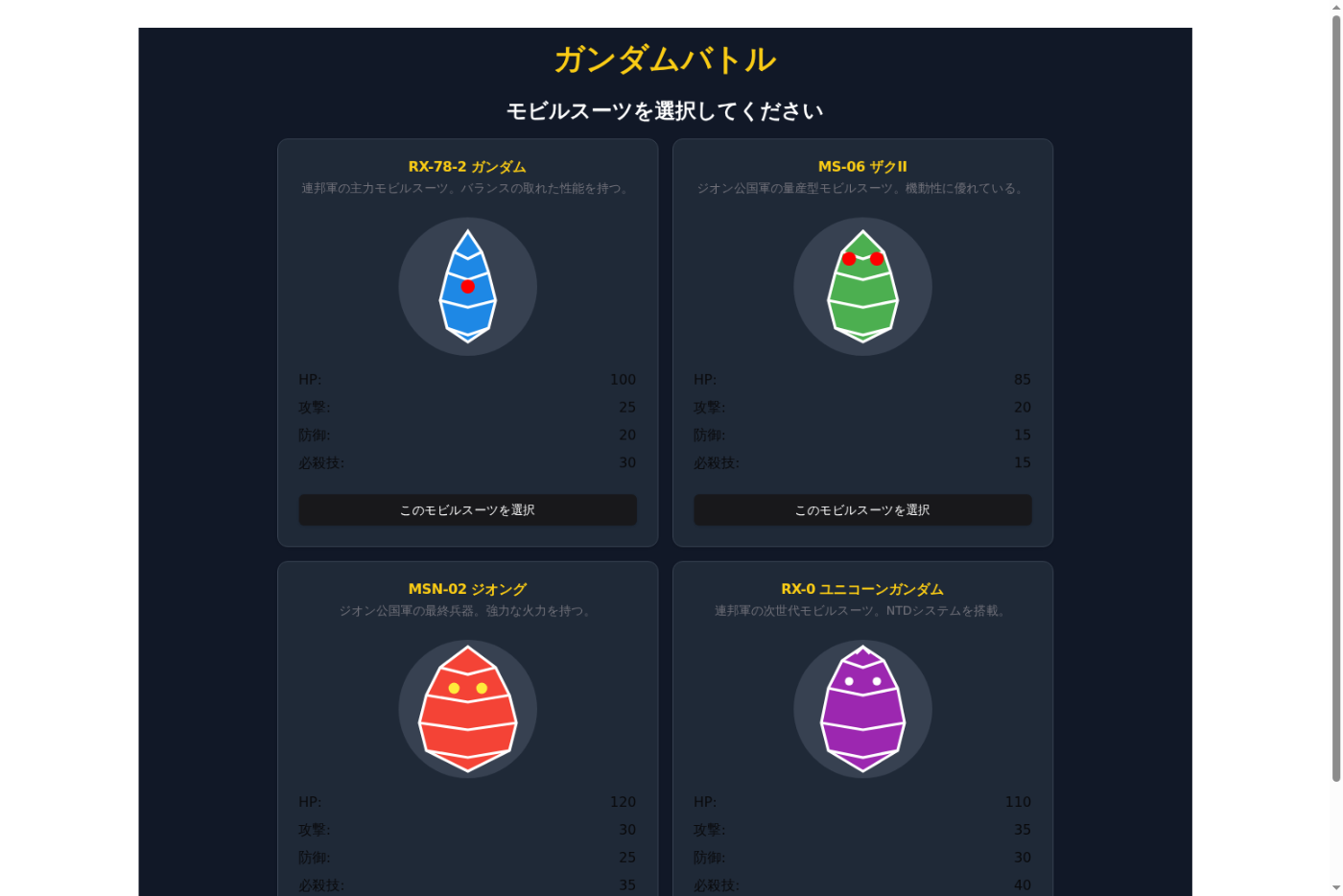 ガンダムバトルは、様々なモビルスーツを選んで戦うバトルゲームです。RX-78-2 ガンダム、MS-06 ザクII、MSN-02 ジオング、RX-0 ユニコーンガンダムから選べます。