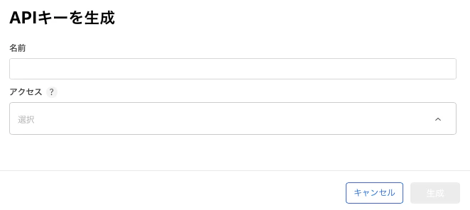 「名前」には識別しやすい任意の名前を、「アクセス」は下記のプルダウンから権限を設定し、「生成」ボタンをクリックしてキーを生成します。