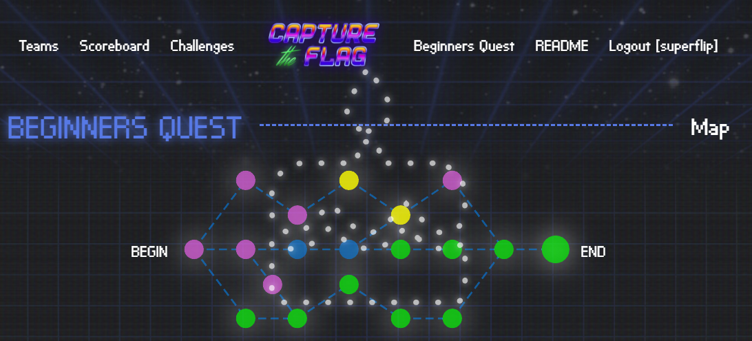本編と初心者向けのBeginners Questが分かれていた。Beginners Questは解いても得点などは無し。初心者向けでも普通に難しい。後からREADMEを見たら、「ヒントが必要ならIRCにjoinしろ」と書かれていたので、ヒントもあったのかもしれない。