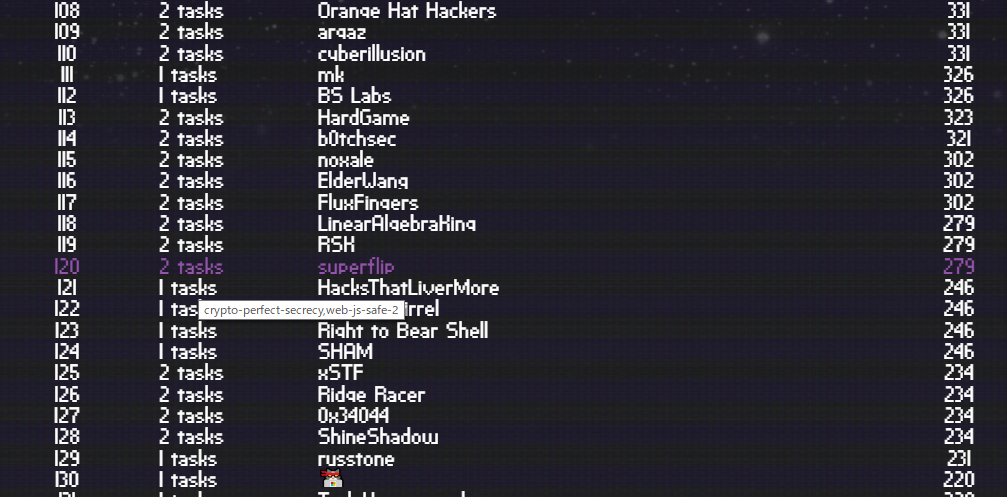 チームsuperflipは、初心者向け問題は全て解けたけれど、本編は2問だけ。279点で120位。