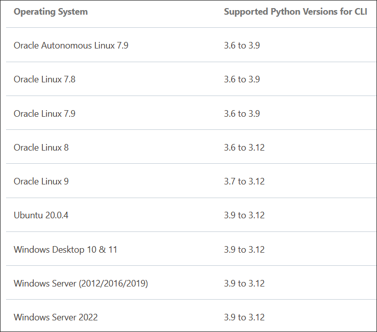 回答:次の表に、各OSに対してCLIがサポートするPythonのバージョンを示しています: