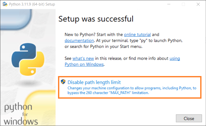 対策-1:Pythonをインストールした後、「Disable path length limit」をクリックする。