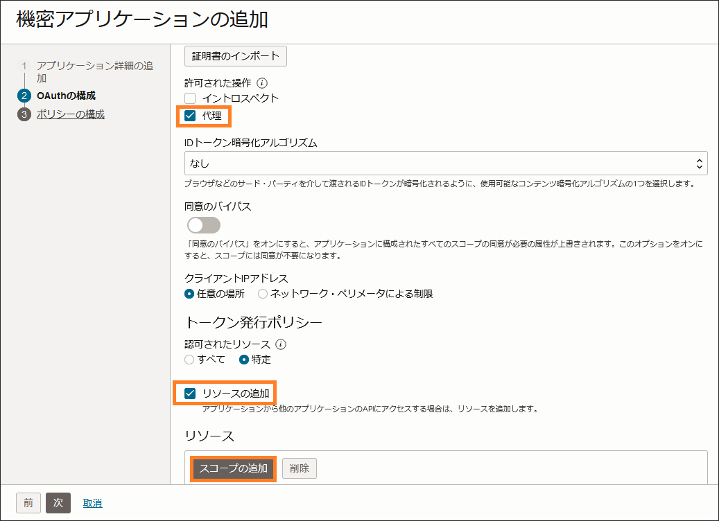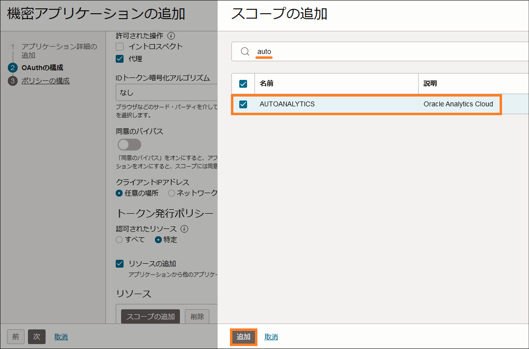 - 「トークン発行ポリシー」に、「リソースの追加」をチェックし、「スコープの追加」をクリックすると、スコープの追加画面がポップアップされる。