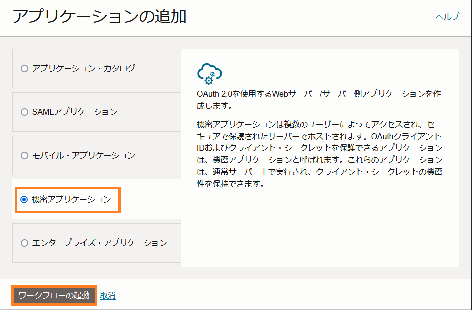 「機密アプリケーション」を選択し、「ワークフローの起動」をクリックする。