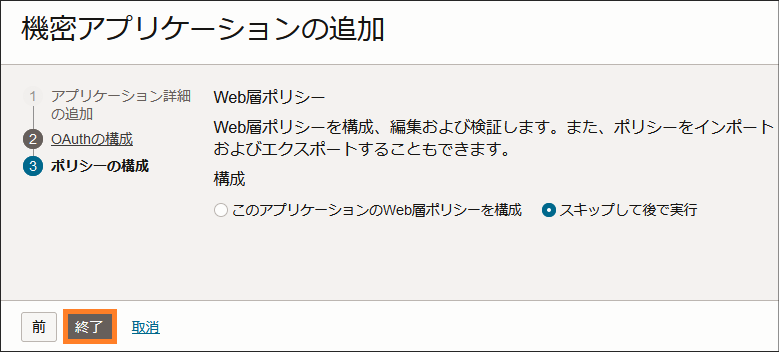 Web層ポリシーのところに、デフォルトの「スキップして後で実行」でよい。「終了」をクリックし、作成を完了する。