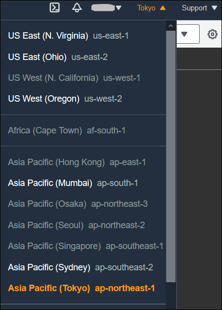 AWS CloudShellは、すべてのリージョンではなく、一部リージョンのみ利用可能です。CloudShellを起動する前に、利用不可のリージョンに切り替えますと、例えば東京から大阪に変更する場合、上部のメニューバーのCloudShellアイコンが非表示になります。使用可能のリージョンからCloudShellを起動した後、メニューのところ、使用できないリージョンがグレー表示されます。