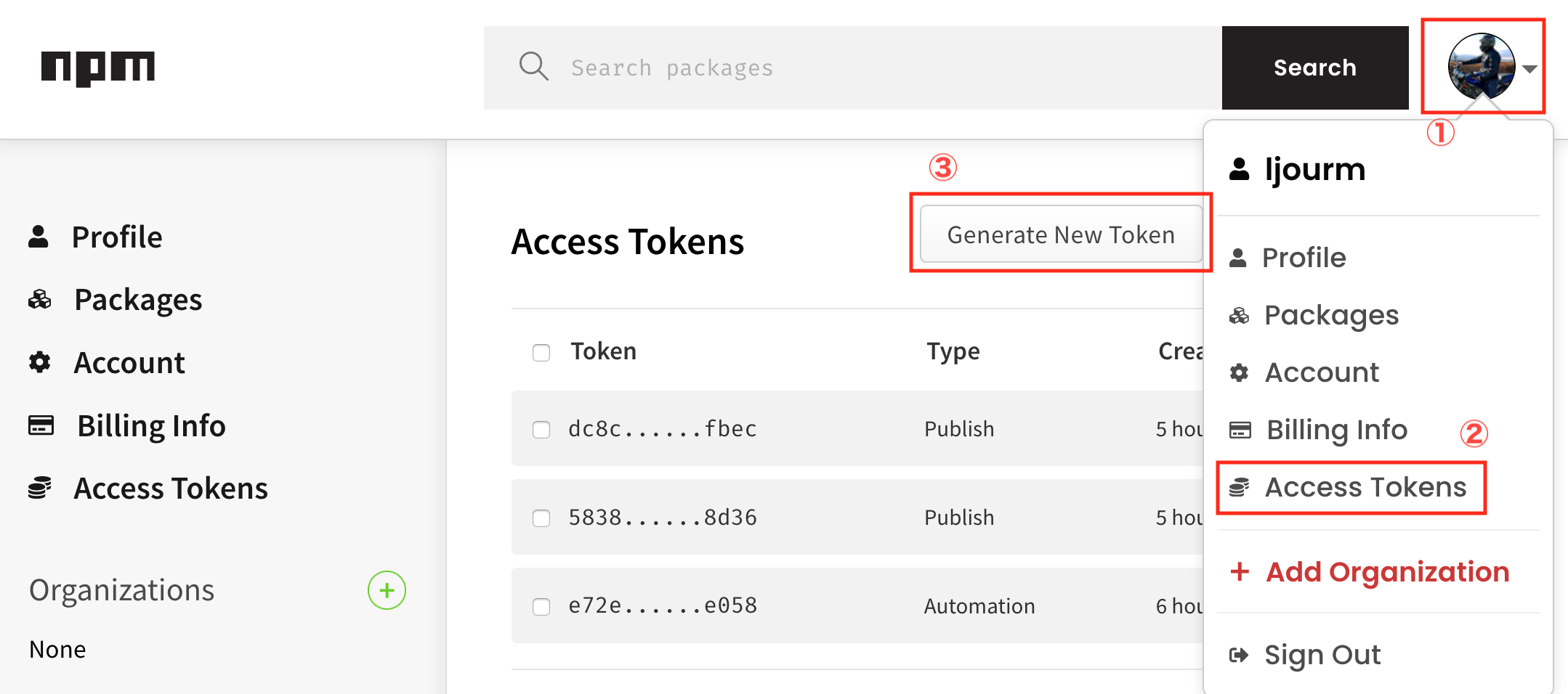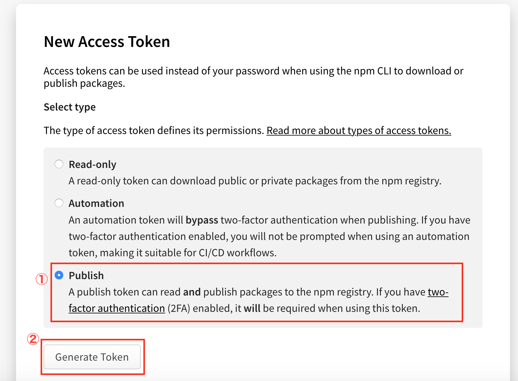 ここではnpm registryからトークンを取得し、GitHubに設定するところまで進めます。
