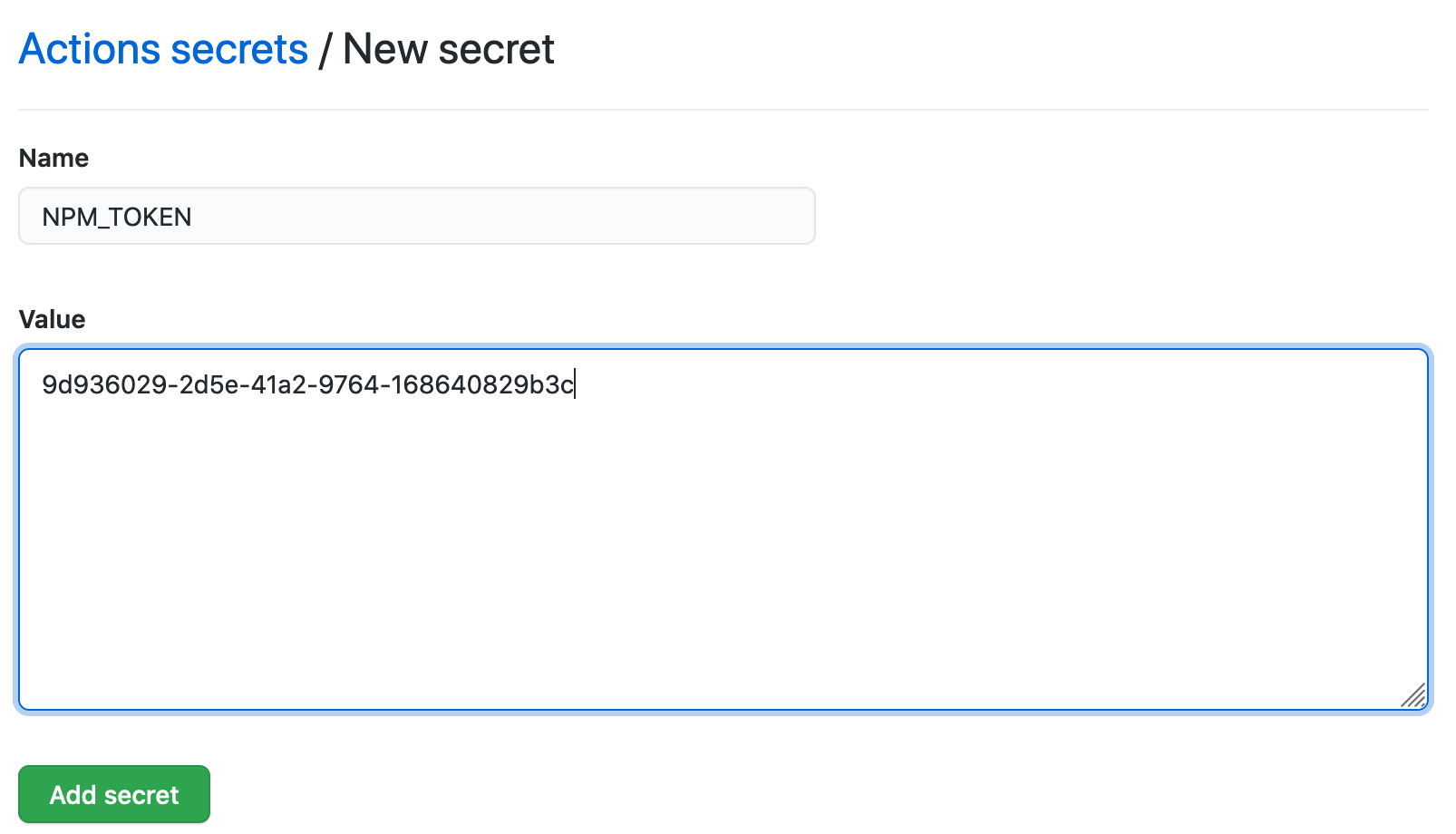NPM_TOKEN(名称は任意。後述のGitHub Actionsで使用する) - Value: 先ほど取得したトークン