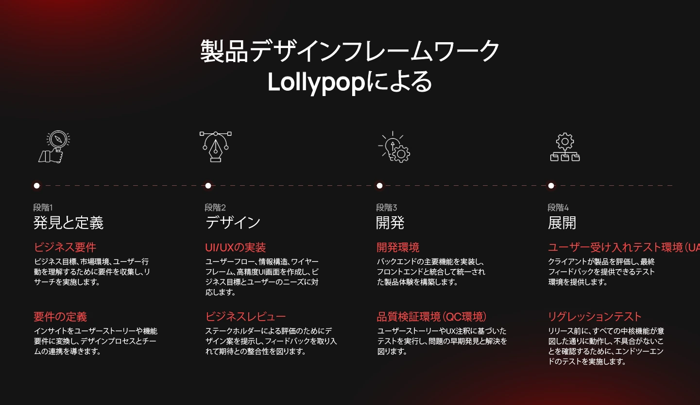 本記事では、Lollypopがインパクトのある製品デザインを実現するための主要な概念と重要要素を紹介しました。また、数多くの成功プロジェクトを通じて構築・洗練してきた製品デザインプロセスについてもご紹介しました。もちろん、すべてに当てはまるプロセスは存在しません。各ビジネスにはそれぞれ異なる背景や目標があり、ビジネス価値を最大化するには、それに合わせた柔軟なアプローチが必要です。