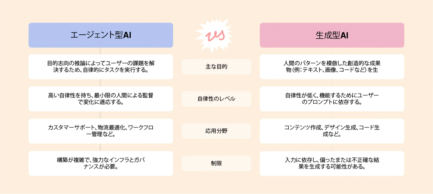 両者はどちらも顕著なブレークスルーを示していますが、目的は異なります。生成型AIは、オリジナルの文章、画像、さらには音楽までも作り出す能力で注目を集めています。一方、エージェント型AIは、ビジネス運営における自律性を静かに再定義し、システムが意思決定を行い、変化する環境に適応し、絶え間ない人間の監督なしで複雑なタスクを実行できるようにします。